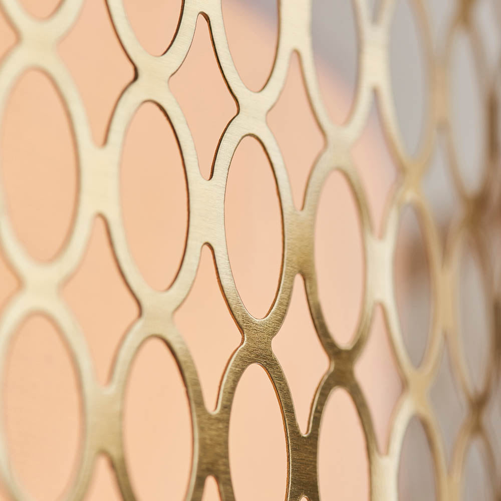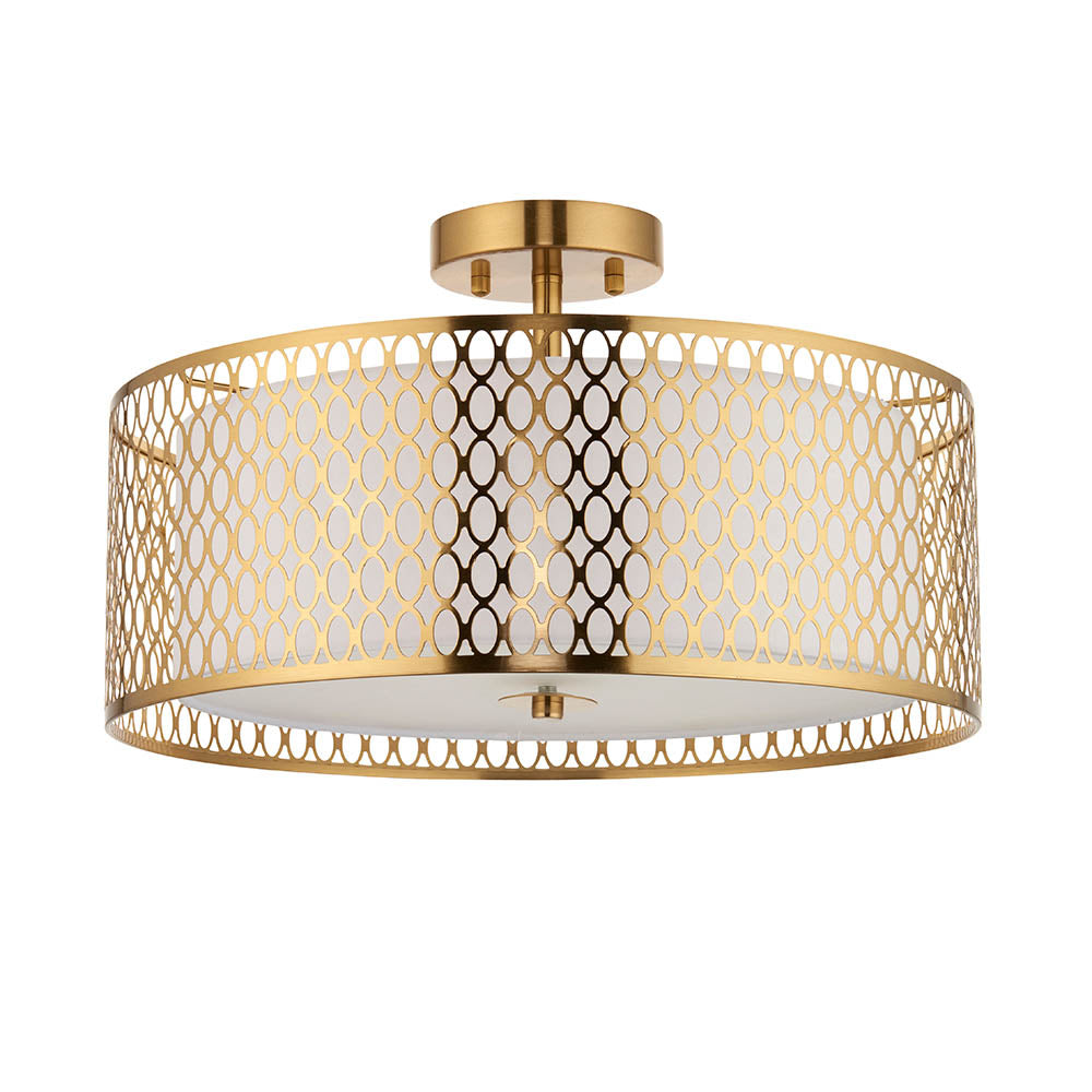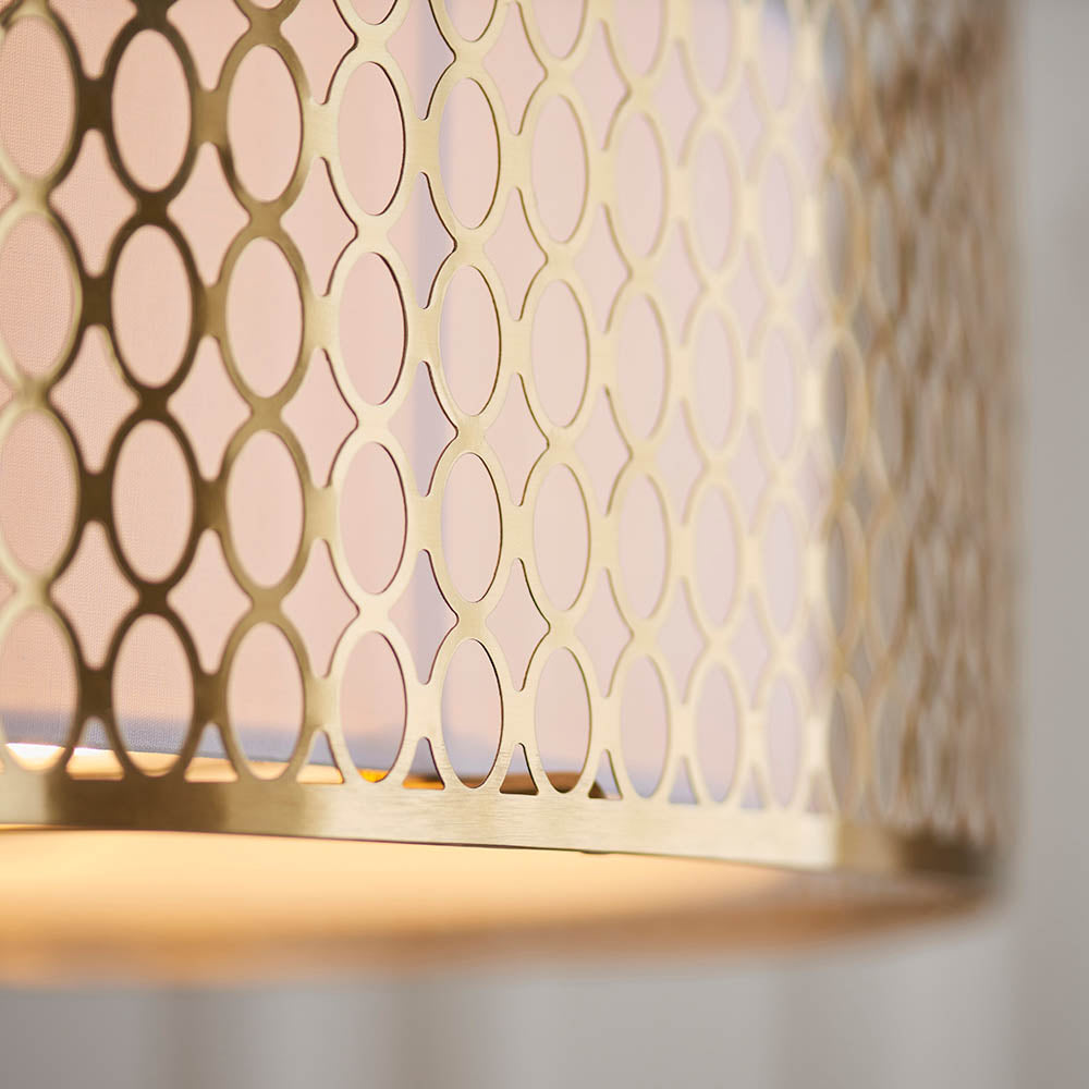 No compromise on design for low ceilings. This is a classic circular light with a trendy geometric fretwork metal outer and an inner fabric shade for lovely light diffusion. In a gold effect plate finish with frosted glass this light would compliment a range of interior styles. This product is also dimmable to create a relaxing atmosphere.