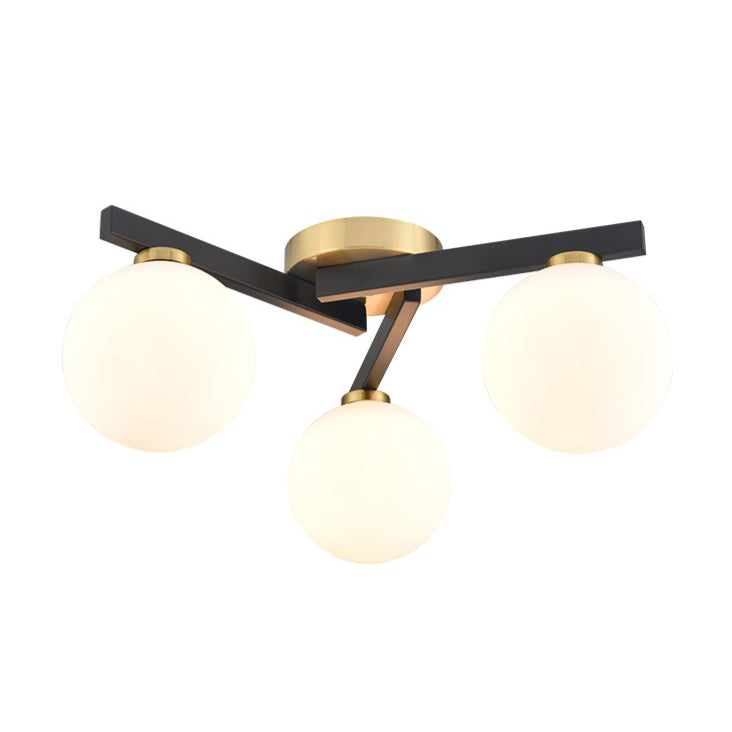 Matt black and aged brass finish 3lt flush fitting with opal glass spheres.
