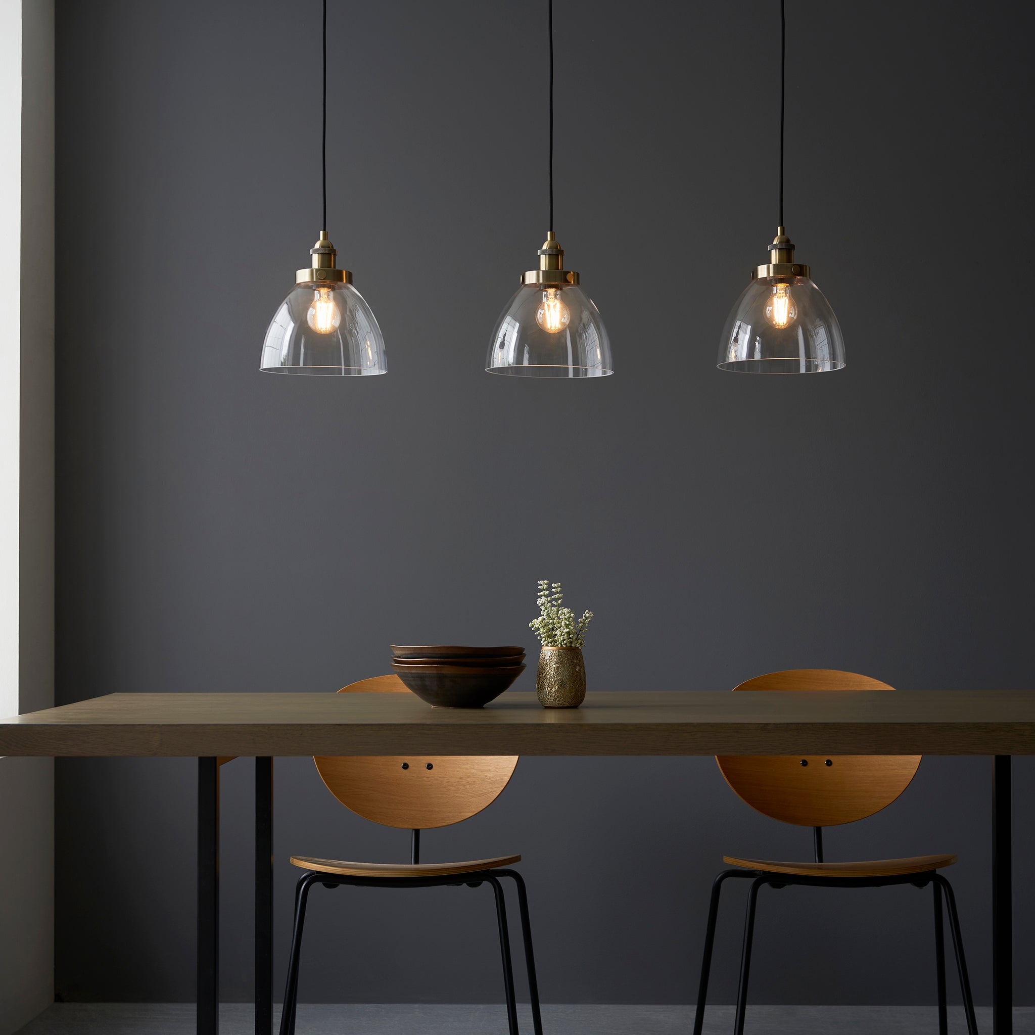 An authentic 'resto' style industrial 3 light linear semi flush, finished in antique brass plating with authentic knurled lamp holder details and clear glass shades. Pair with filament LED lamps for that perfect industrial style. Ideal for above a breakfast bar or dining table making the perfect addition for today's stylish homes to create that on trend bar, bistro look. Other Family items available.