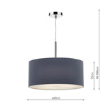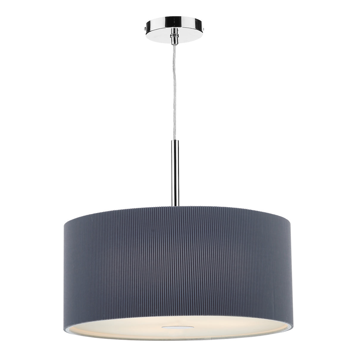 This 60cm 3 Light Pendant has a polished chrome ceiling plate and comes complete with a grey micro pleat shade and frosted acrylic diffuser.