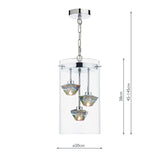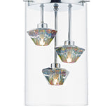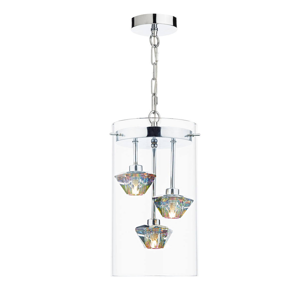 3 lustrous dichroic glass encased in a clear glass cylinder with chain suspension. Height adjustable on installation supplied with 1 meter of chain.