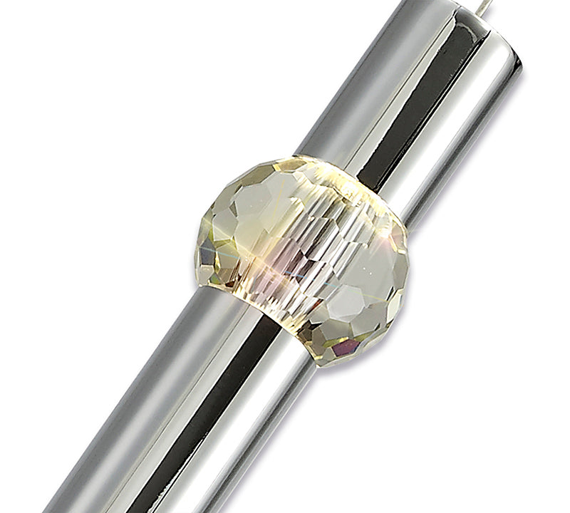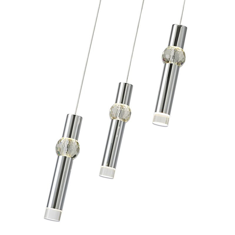 This range offers a sleek and modern design that creates a futuristic aura with its slim polished chrome tubes. The integral LEDs emit a warm light filtered through the clear acrylic section at the bottom of each cylinder and the substantial spherical crystal sphere which produces spectral patterns with its faceted cut. Available as a single pendant, 3 light linear or 3 light round, there are ample applications that this range would be perfect for.