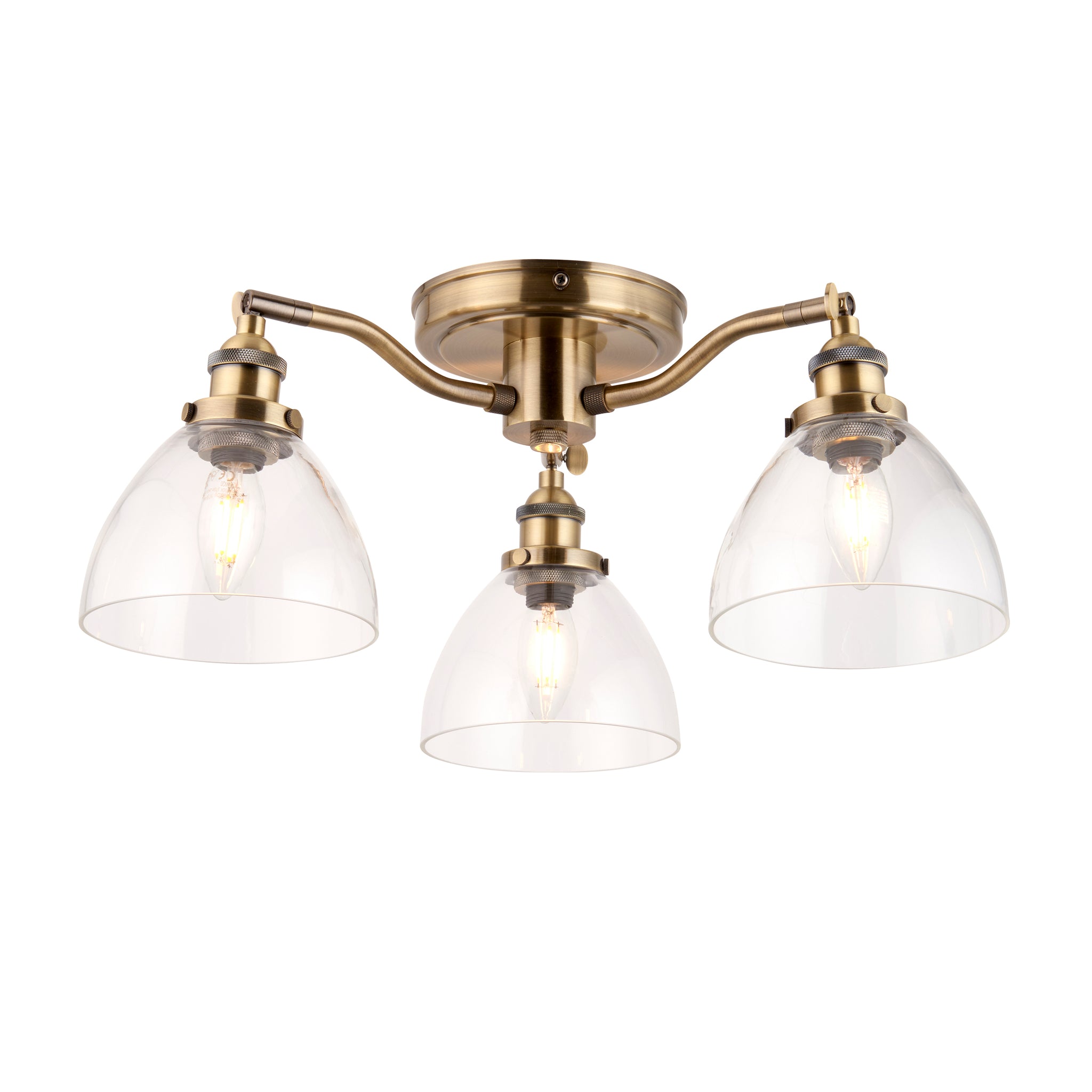 An authentic 'resto' style industrial 3 light semi flush, finished in antique brass plating with authentic knurled lamp holder details and clear glass shades. Pair with filament LED lamps for that perfect industrial style. The perfect addition for today's stylish homes to create that on trend bar, bistro look. Other Family items available.