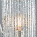 A unique classic styled chandelier in bright nickel plated finish. Inspired by hurricane lamps, the clear ribbed glass shades with bubble details create a perfect diffused light when lit by filament LED lamps. Each shade rests subtly on the rectangular section hoop and is suspended by three fixed arms.