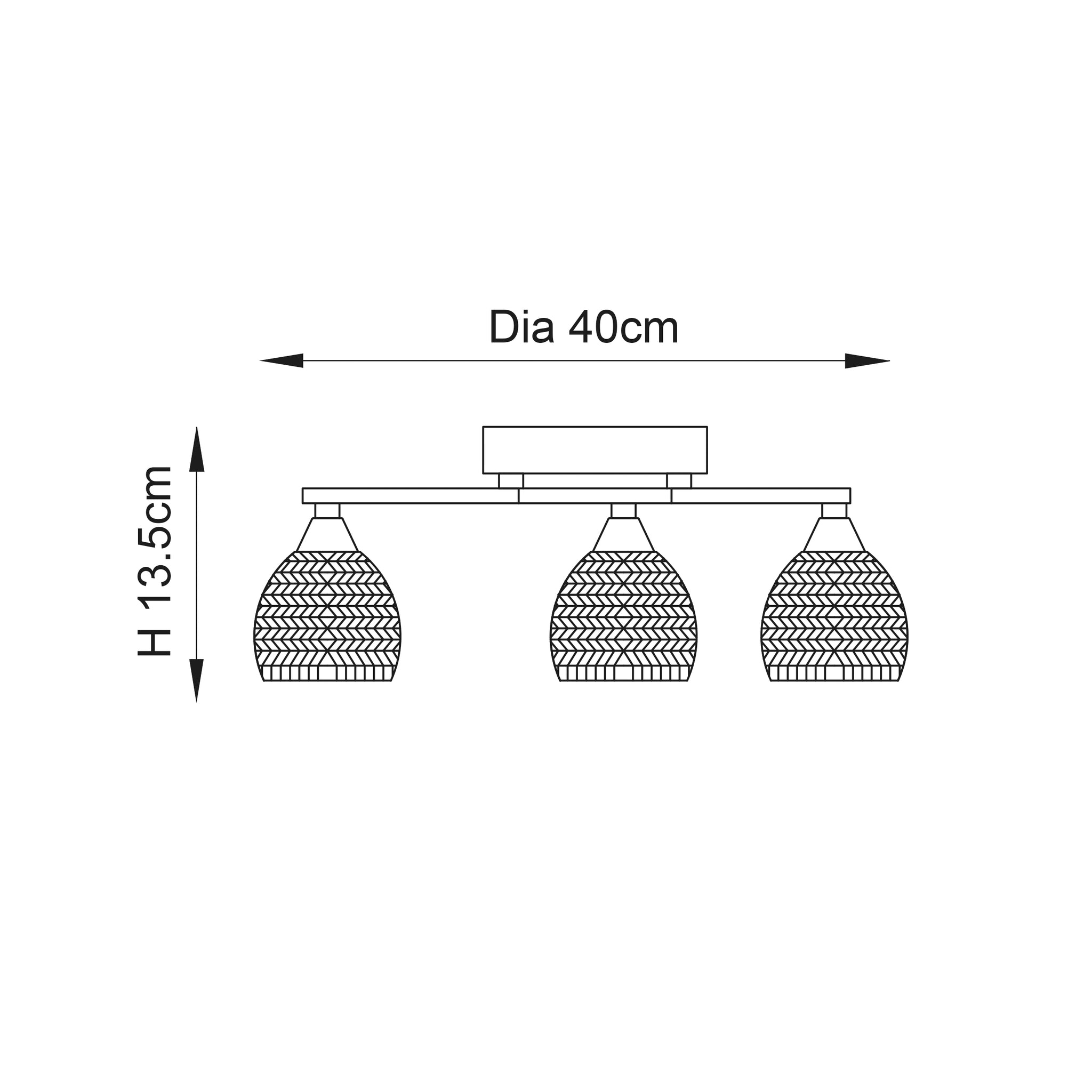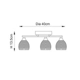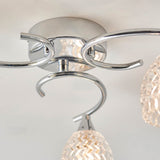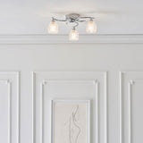 A 3 light flush ceiling fitting with curved metal arms in a chrome finish, and cut glass shades. suitable for use with LED lamps and dimmable. Matching items and other colour options available