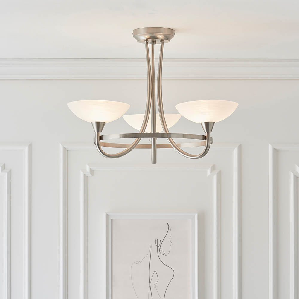 This 3 light semi flush is finished in satin chrome effect with white painted glass shades with faint line detailing. suitable for use with LED lamps and dimmable; matching 5 light semi flush and wall light options and antique brass finish also available