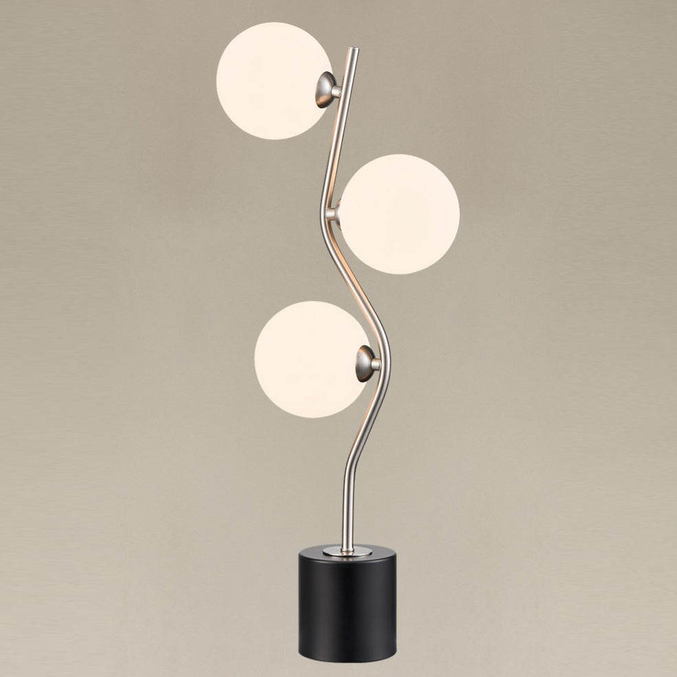 Satin nickel finish 3-light table lamp with opal glass spheres and black base. There is an in-line switch on the cable.