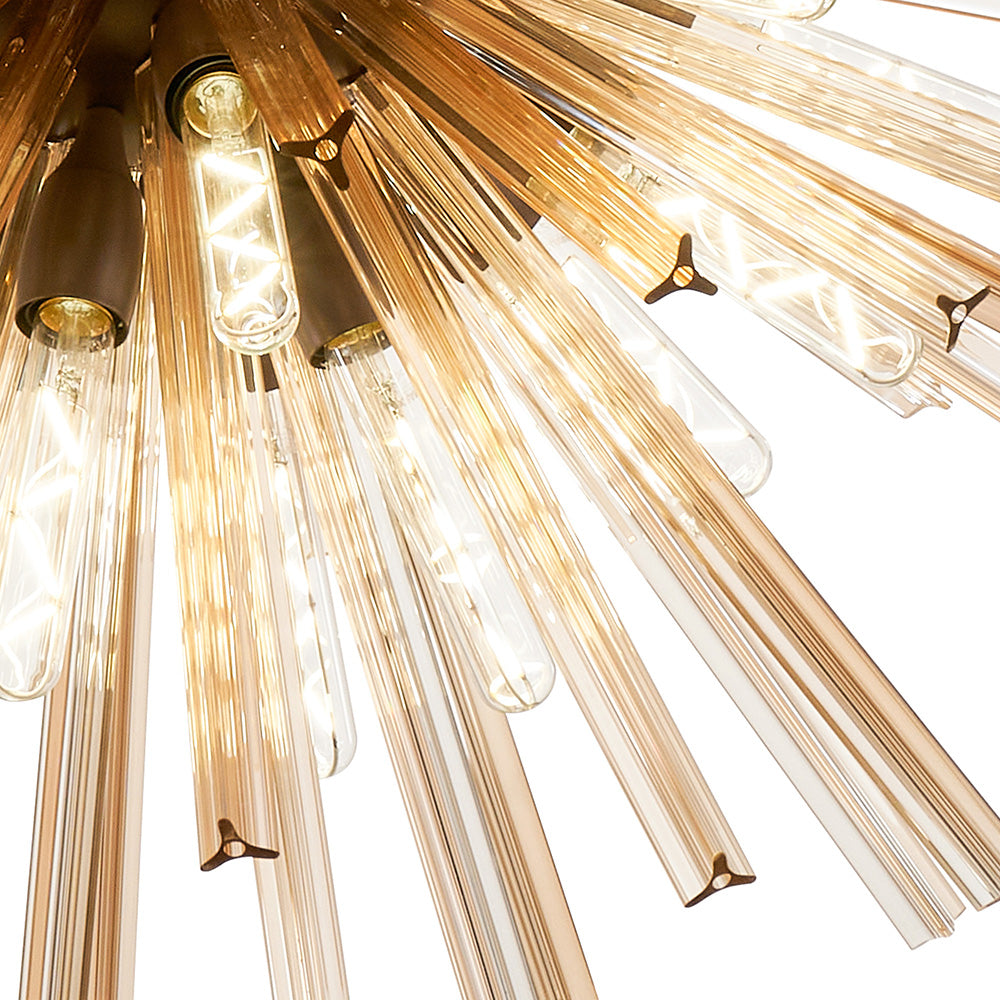 The collection presents an intriguing glass shape moulded into a three dimensional triquetra. The grooves along each sized glass create an appealing optical effect which is effortlessly enhanced with the use of tubular lamps. The wide variety of fixtures available in this range span from a 6 light semi flush to an impacting 32 light pendant. The complementing wall lamps available allow for further application built around the same lighting family. Each frame can be chosen with either a brown oxide, polished nickel or matt black frame with either clear, champagne gold or smoke glass.