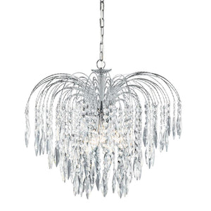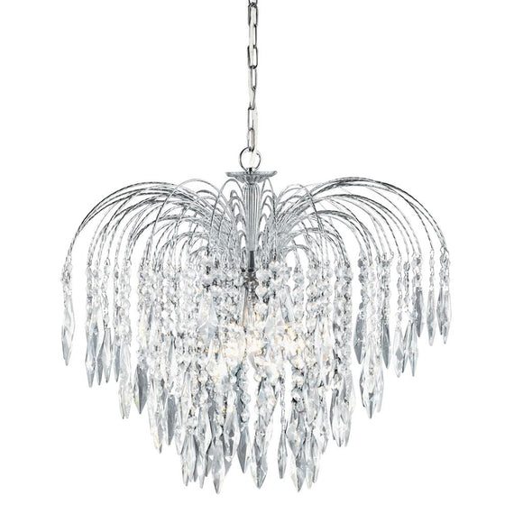 A stunning blend of vintage elegance and bold silhouettes. This 5 light ceiling fitting features sleek curved chrome finish arms around a decorative central frame, with overlapping tiers of shimmering crystal buttons and drops that create a picturesque cascading light effect and form a dramatic Waterfall effect when illuminated