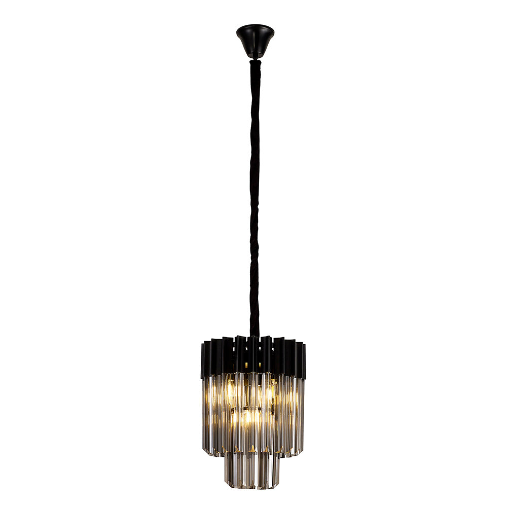 The popularity of this collections initial release has been so overwhelming that the collection has now been extensively expanded to meet a wider range of specification needs. This contemporary design which originally combined a traditional brass finish with clear sculptured glass pieces, now offers a polished nickel or matt black finish with either clear, cognac or smoked glass. The long angular shape of the glass which are in a tiered form, can now be found on larger more dramatic designs including a five tier and rectangular pendant to name only a few. This range has a traditional regal effect composed with modern materials to create a range suitable for either a modern or more traditional room setting. The unique pyramid forms protruding from the frame provide an intriguing overall shape across this comprehensive collection.