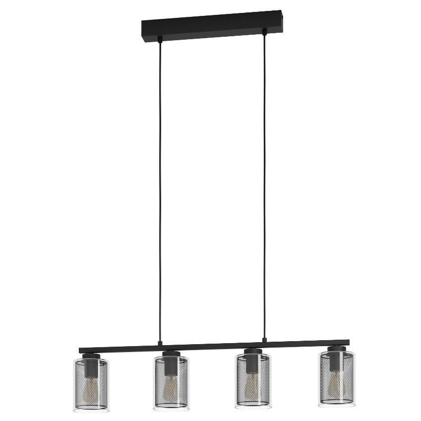 This pendant light has a long black metal mount suspended from a metal canopy of the same colour. The design has four lampshades, each featuring an outer clear glass cylinder and an inner cylinder made of fine expanded metal mesh in black. The mesh creates a fascinating play of light and shadow as soon as the light is on. The trendy pendant light integrates perfectly with modern interior design trends and provides distinctive lighting in the living room or above the table in the dining room. The pictured filament lightbulbs are not included. The product has E27 lamp holders and requires E27 lightbulbs.
