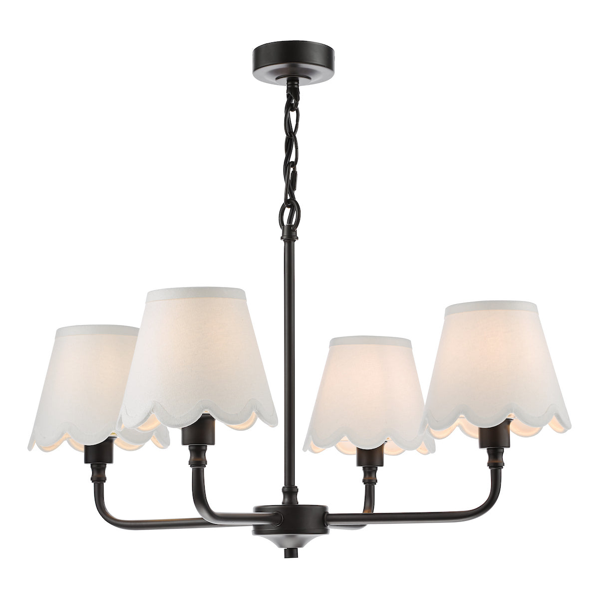 A versatile black ceiling light that marries classic and contemporary design. Complete with a scalloped edged linen shade, this matt black fitting boasts a sleek, nearly-black finish that adds a touch of sophistication to any room. Part of a complete collection, this adaptable piece allows you to create a cohesive lighting scheme throughout your home. Whether you're after a minimalist statement or a bold centrepiece, the 4 Light Pendant is the perfect canvas for your lighting vision.