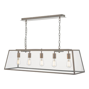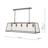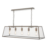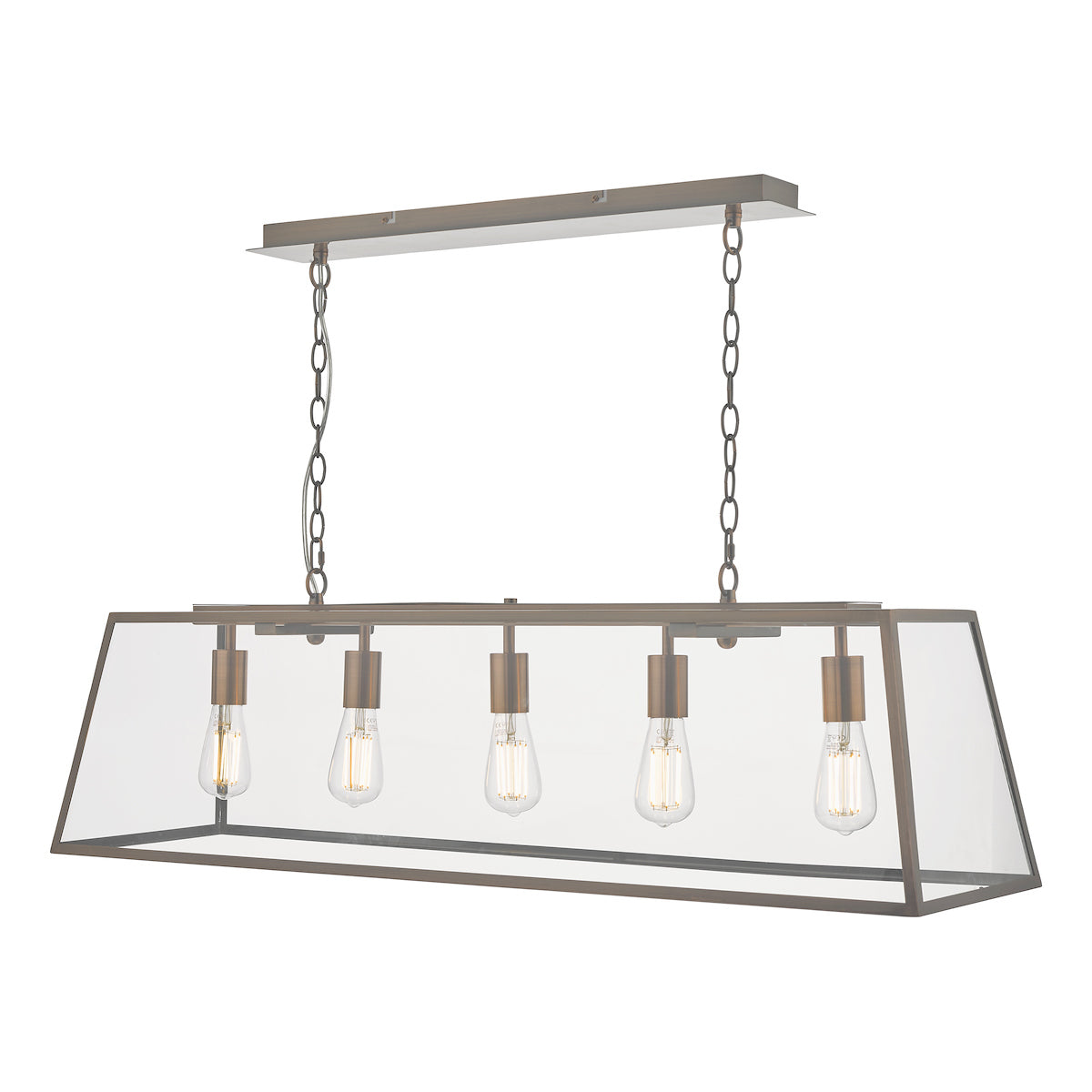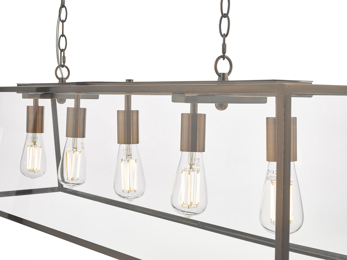 Perfect for use over kitchen islands or dining room tables, this 5 Light box Pendant has a antique copper ceiling plate and frame with clear glass panels.