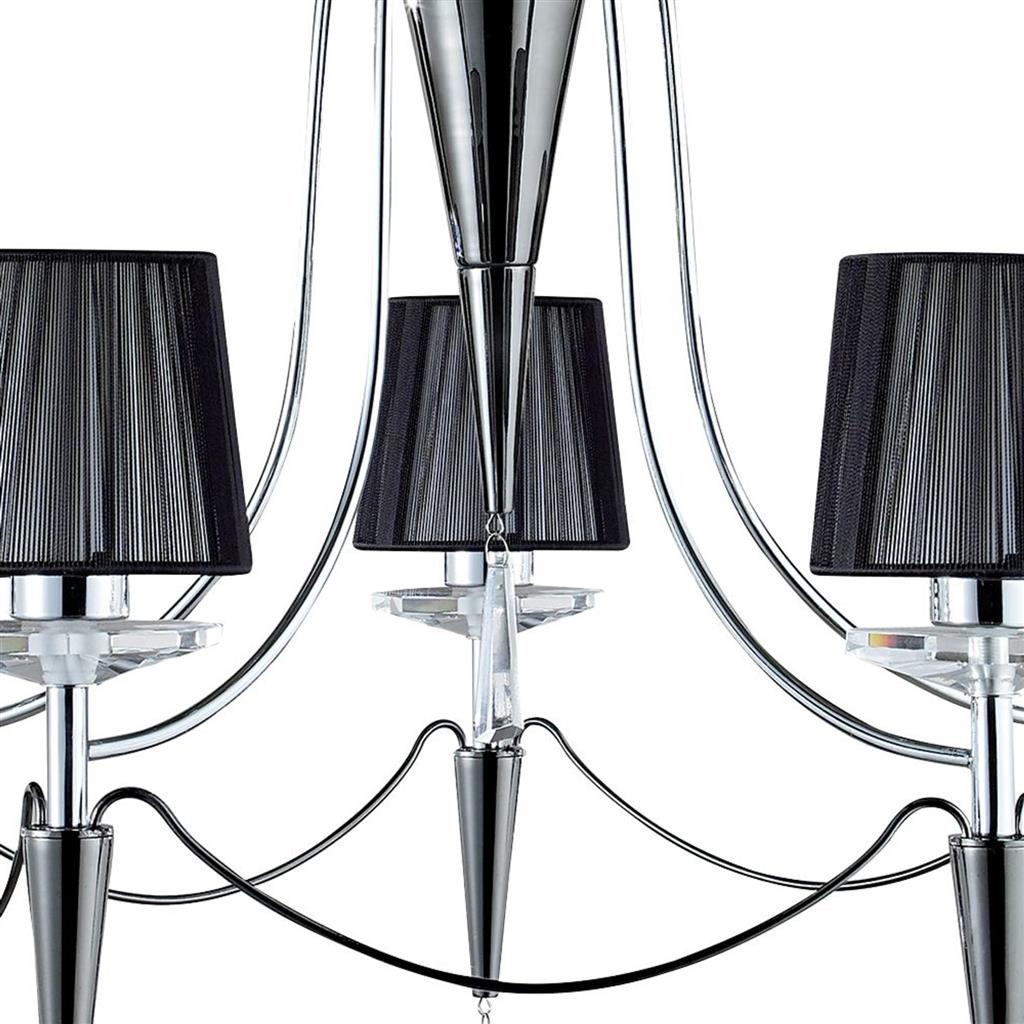 Chrome 5 light fitting with black string shades and crystal sconces is dark, sensual and looks stylish on any bedroom, living room, dining room or kitchen ceiling. The five black string shades provide a subtle source of light, and the piece is adorned with elegant crystal sconces. This chain suspension can easily be adjusted for different ceiling heights so this modern chrome finish fitting can set the tone for the entire room.