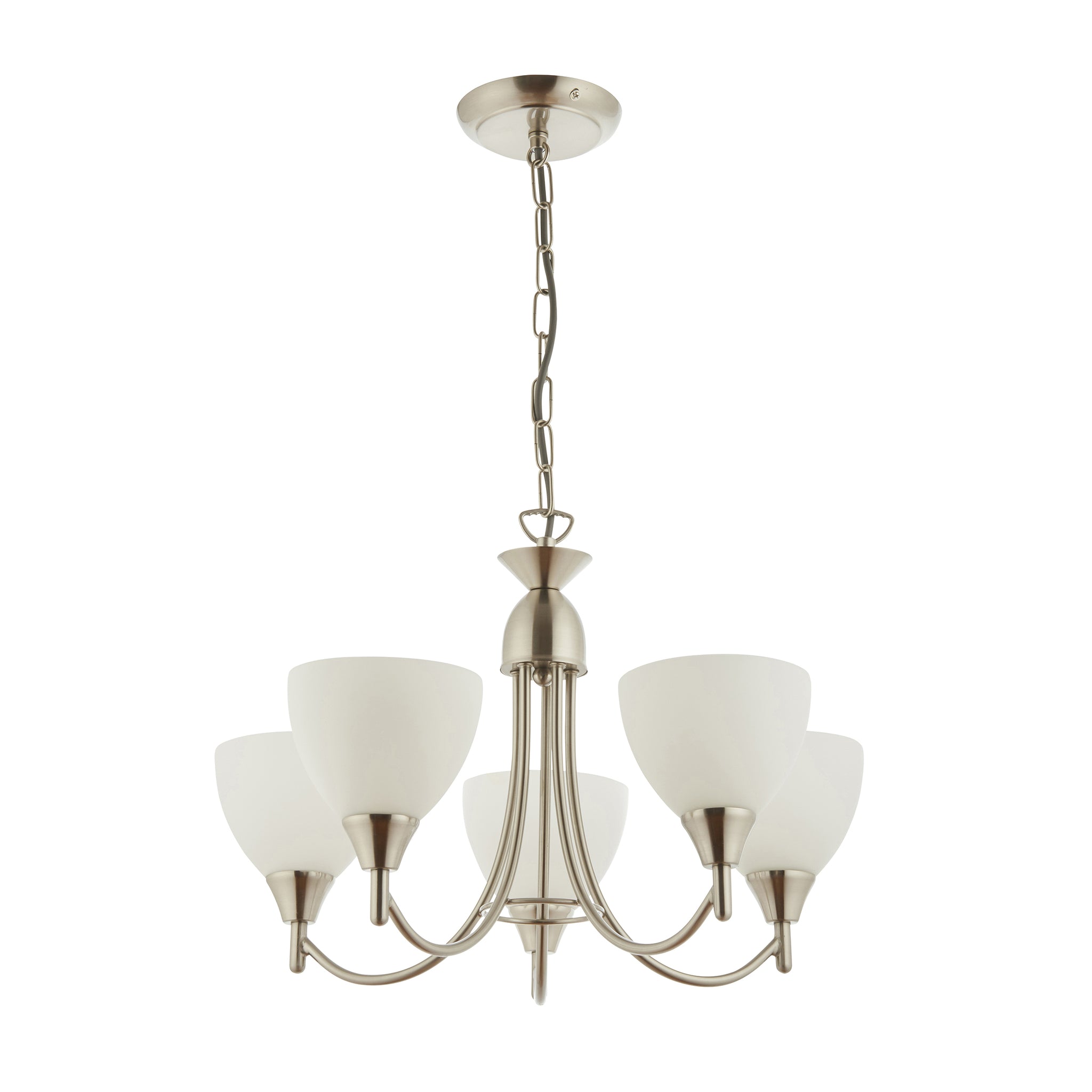 5 light ceiling pendant finished in satin silver with matt opal glass shades. (0711ALT18055SC)