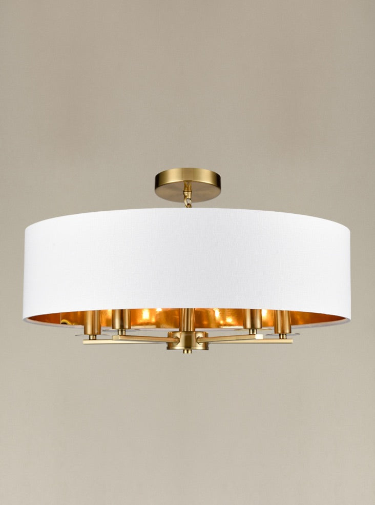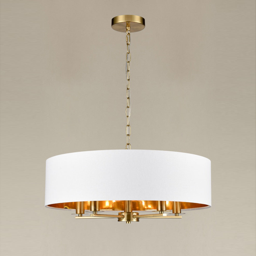 Aged brass finish pendant with cream textured fabric shades and brushed gold inner lining. This pendant is supplied with a chain suspension which can be shortened to accommodate low ceilings.