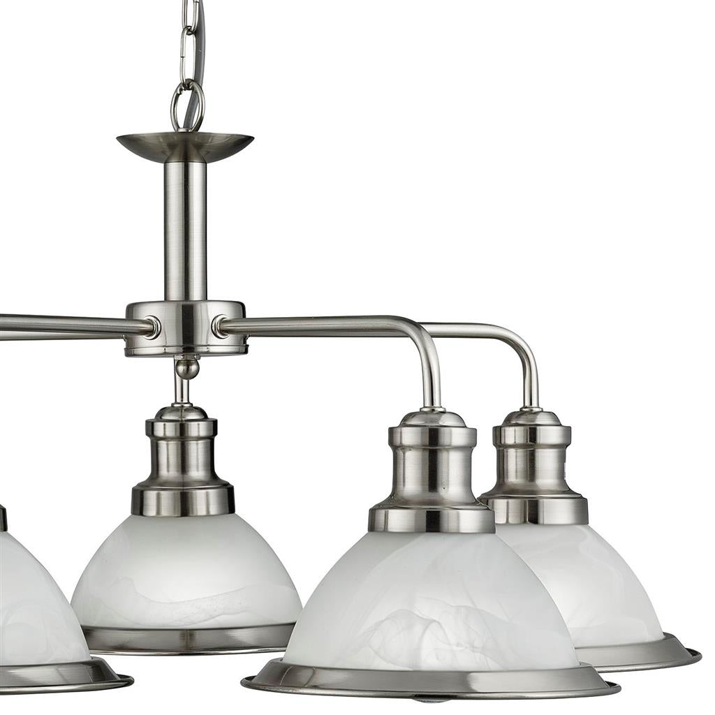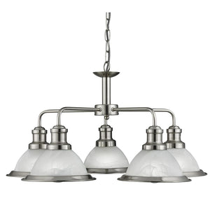 This satin silver 5 light ceiling fitting with acid glass shades has a simplistic look that will add a retro feel to any dining room or kitchen. Reminiscent of the style of classic diners and bistros, the ceiling light comprises of five classic art deco shades finished in a sleek satin silver, with acid glass to provide clean lighting effects. This ceiling light brings a distinctive and elegant style to any setting, and the chain can be adjusted for different ceiling heights.