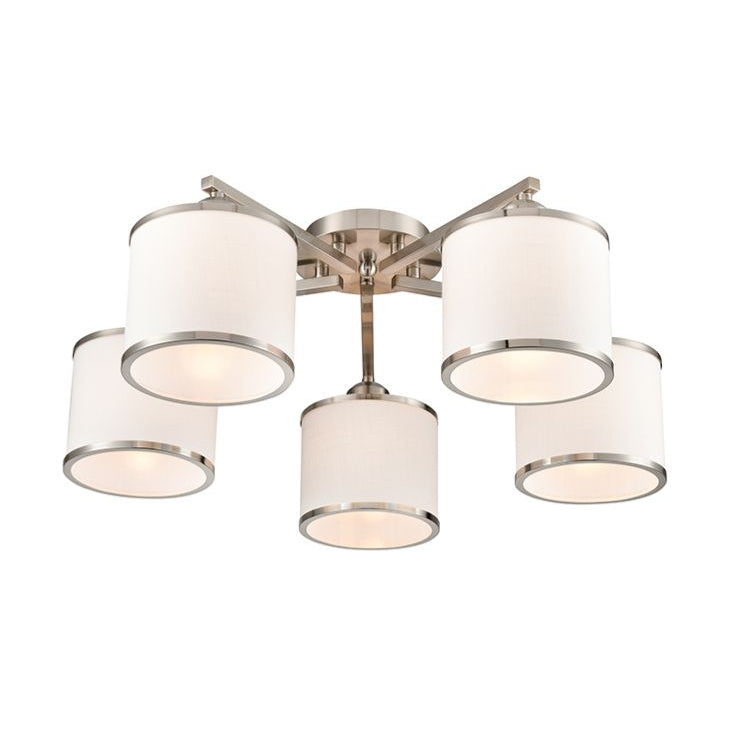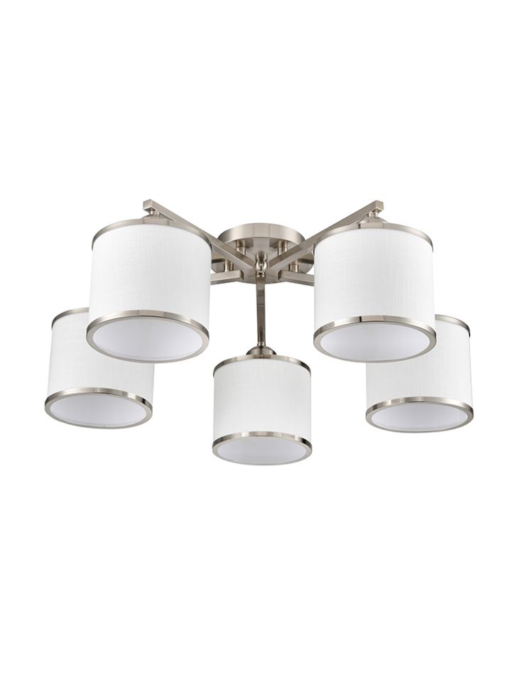 A five lighting fitting in satin nickel finish with off-white textured fabric shades featuring matching trims. Suitable for low ceilings.