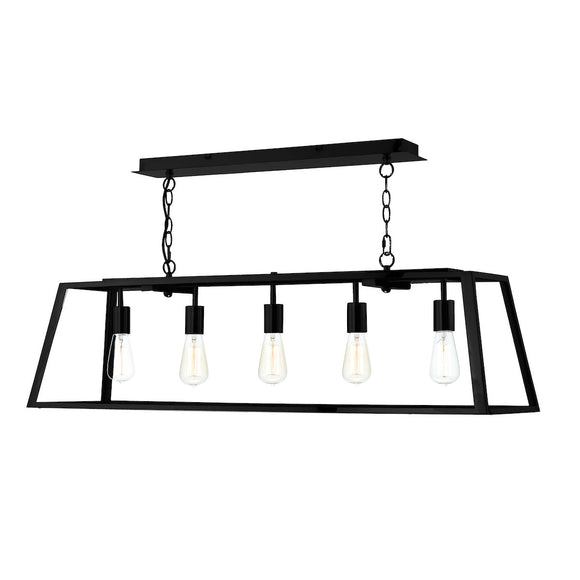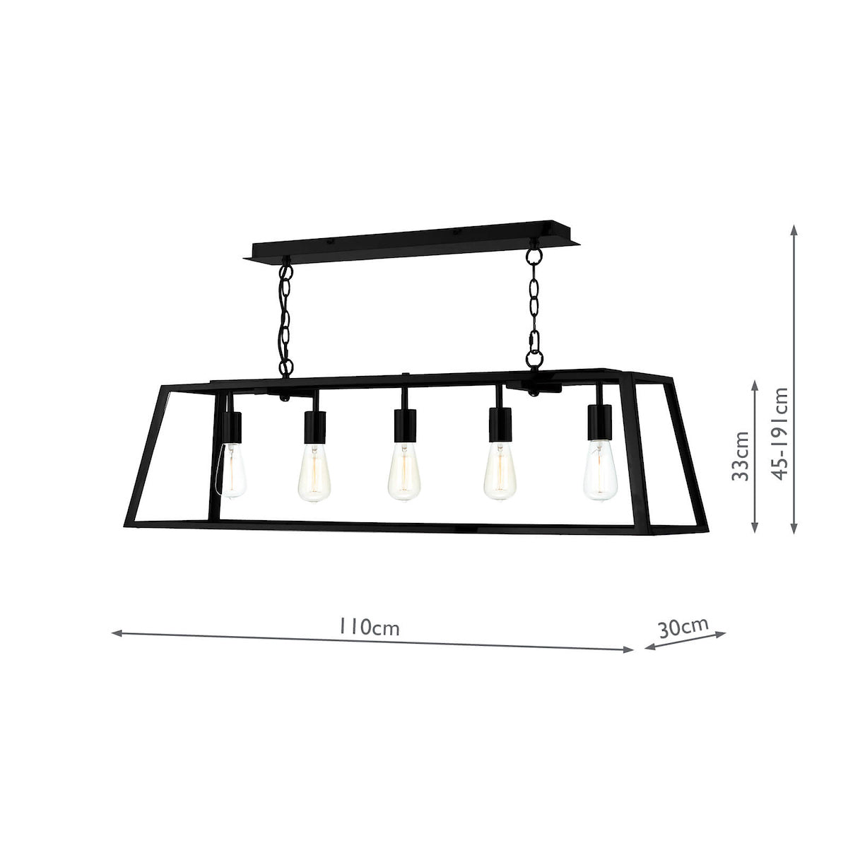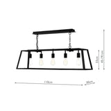 Perfect for use over kitchen islands or dining room tables, this 5 Light box Pendant has a matt black ceiling plate and frame with clear glass panels.