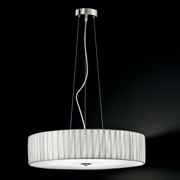 In satin nickel finish with a silver translucent textured fabric shade and a glass diffuser at the base.
