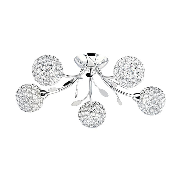 This chrome 5 light fitting with clear glass shades and leaf decoration looks beautiful on any bedroom, living room, dining room or kitchen ceiling. The ornate chrome finish fitting features five elegantly crafted flower head spheres, made from chrome finish hoops and clear glass buttons, which look stunning and create a fabulous lighting effect.
