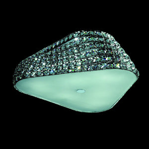 This 6 light flush fitting boasts a polished chrome finish and clear crystal detailing in a modern contorted design. Its unique appearance exudes elegance and sophistication, offering both a dazzling display of light through the crystal shade and a gentle radiance through the frosted glass diffuser when lit.