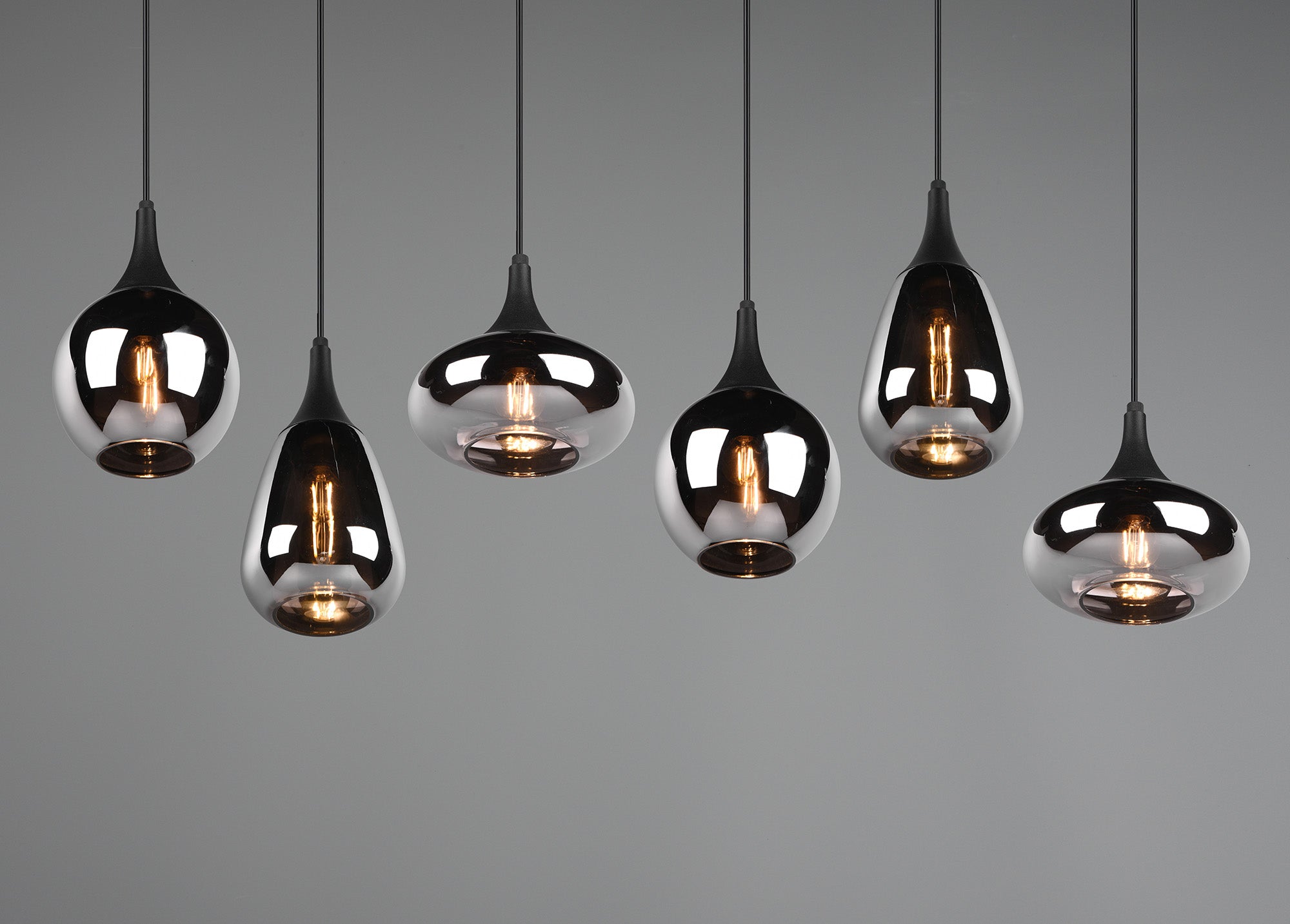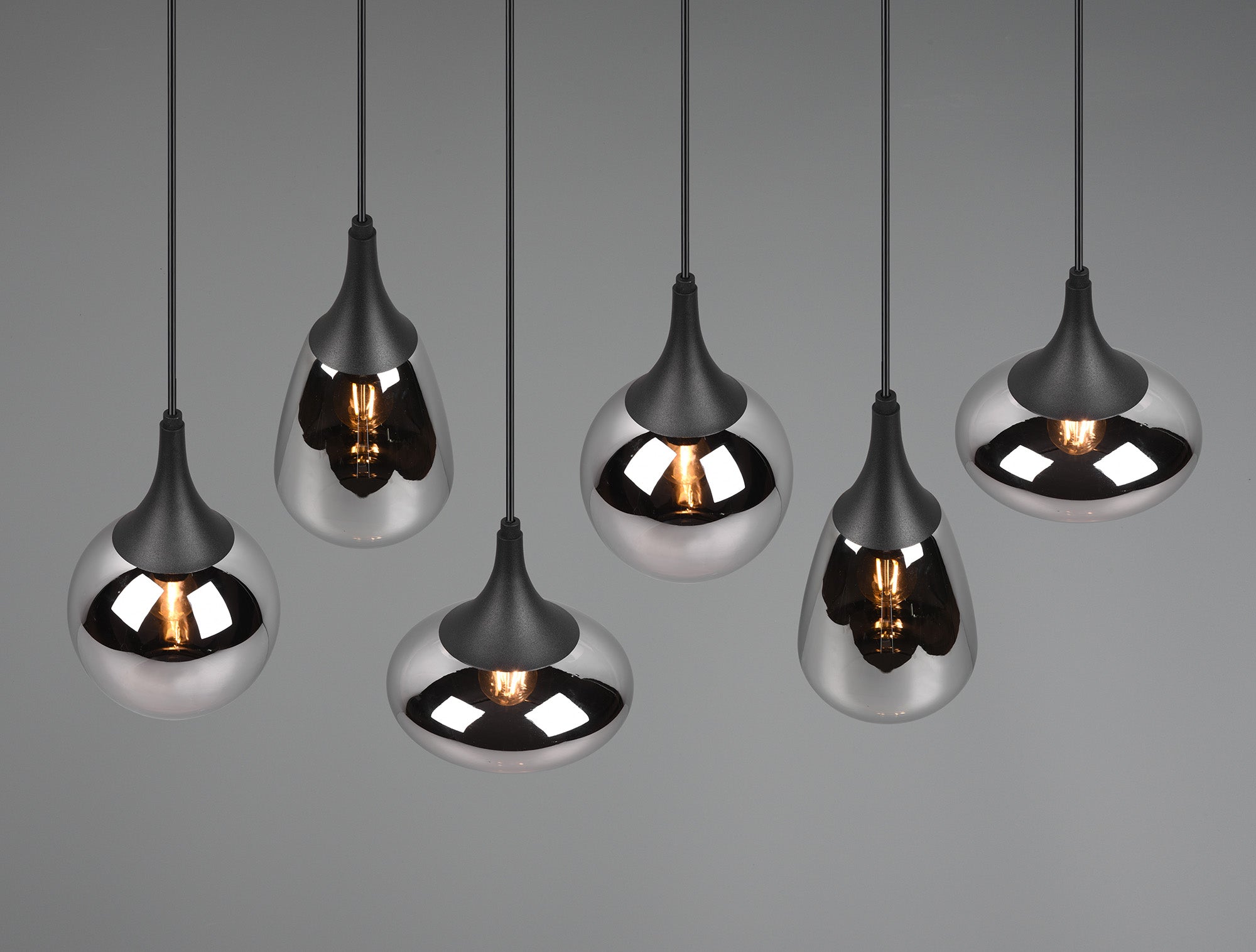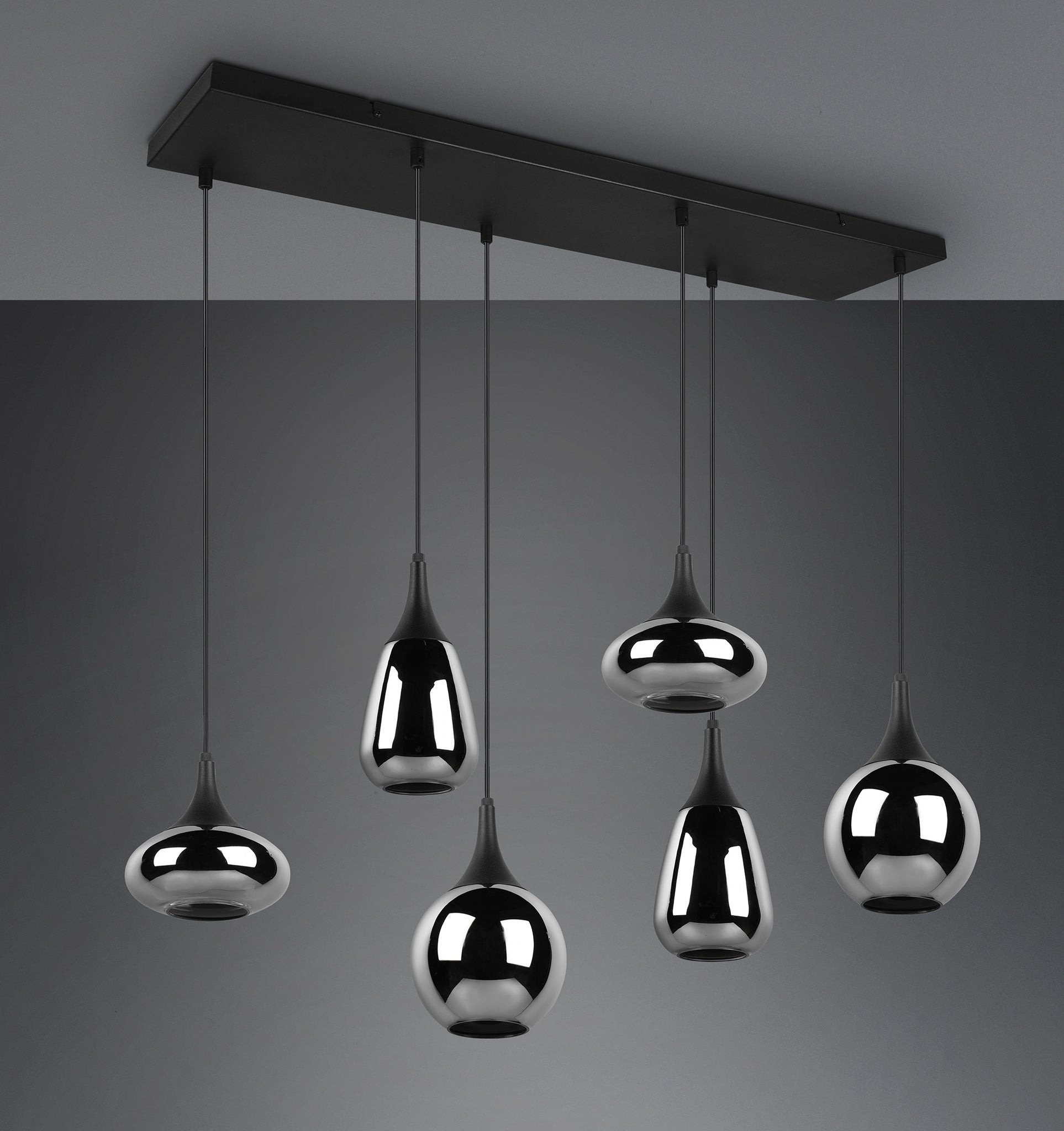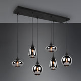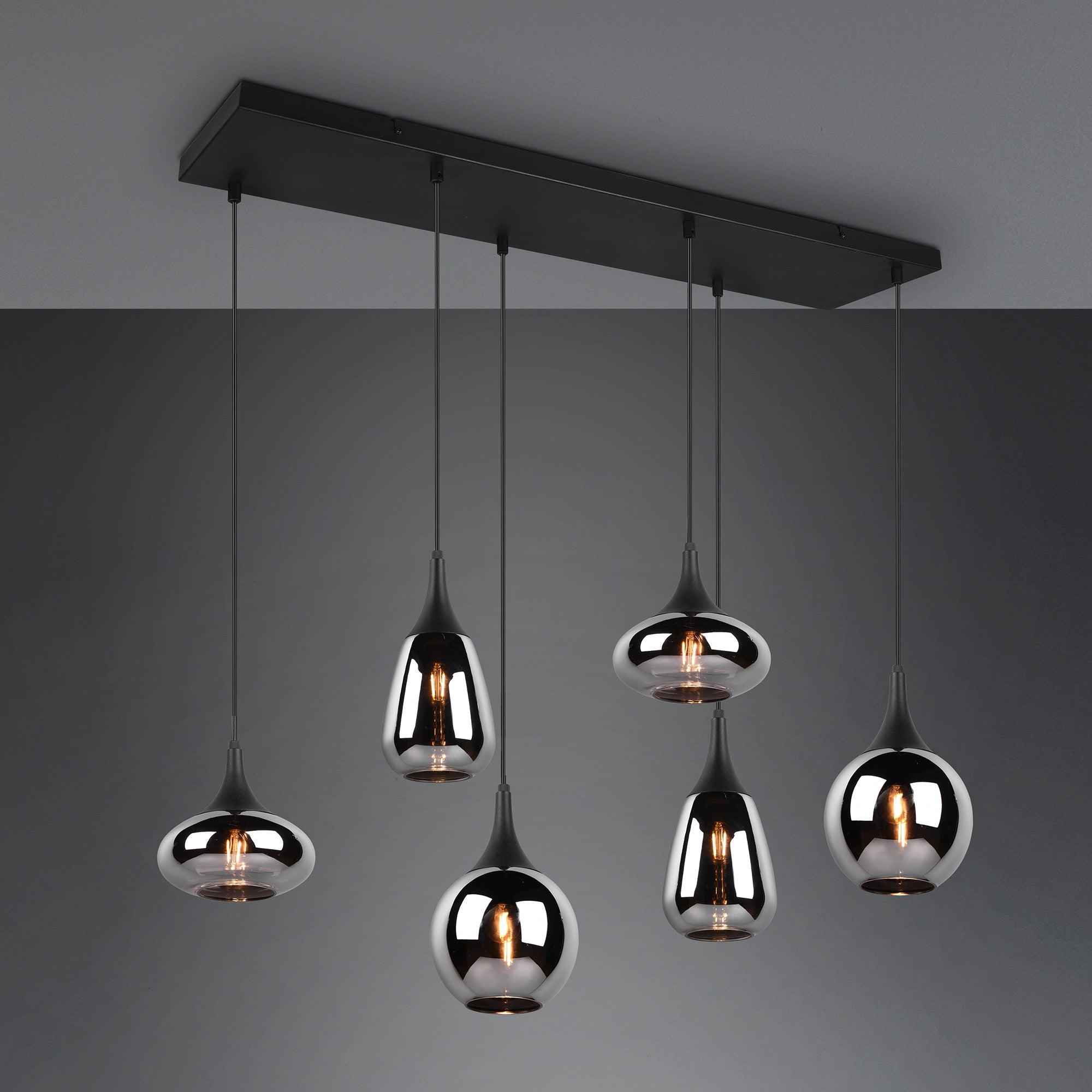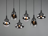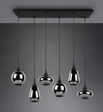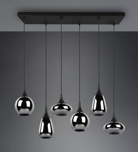 This pendant luminaire will be a special eye-catcher in your living area thanks to the noble glass shades! The different shapes of the six shades and the composition of metal and glass create a beautiful and unique light atmosphere and breathe a modern touch into your dining area. Thanks to the colour design in matt black and the glass shades in steamed chrome, there is plenty of scope for other colour shades, making it wonderfully easy to integrate into existing living concepts. For energy-saving lighting, it is recommended to use an LED illuminant. These are an optimal alternative to conventional halogen lamps and stand for a high quality of light and energy savings of up to 80%. In addition, LED lamps help you benefit from a long service life, low heat generation and at the same time protect the environment.