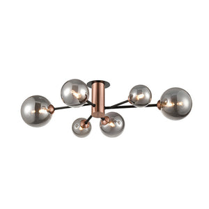A 6-light ceiling mounted fitting with smoke-coloured glass spheres in varying sizes, finished in matt black and copper. This fitting is suitable for low ceilings.