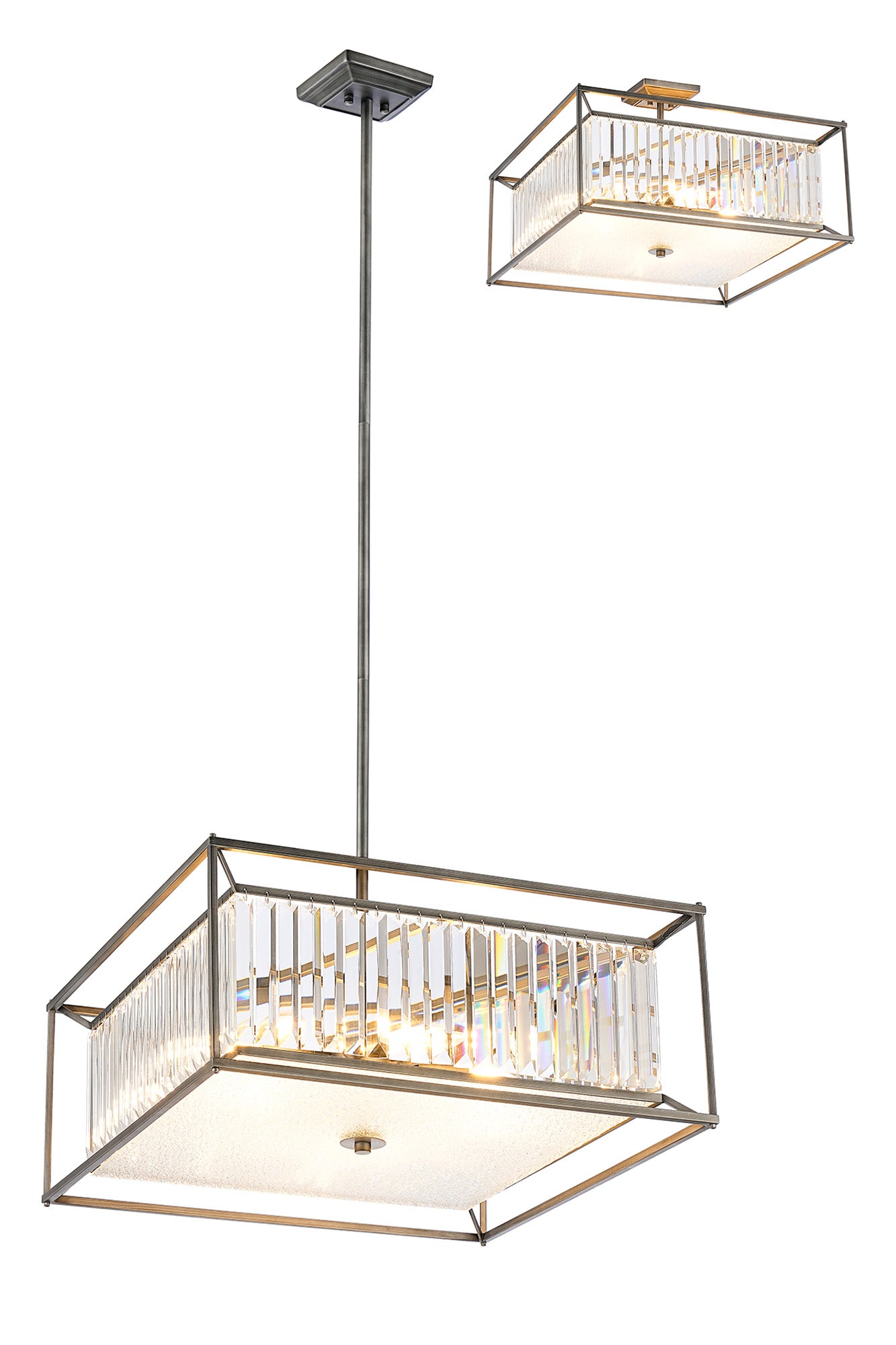 The open cuboid, pewter framework of the Maker range perfectly displays and enhances the inner border of clear rectangular crystal pieces. Available in three sizes, each pendant suspended by a fixed rod is supplied with additional parts so they can be converted to a semi flush fixture. The high quality crystals conceal the E14 lamp holders for an artistic visual when both illuminated and not. The grain glass diffuser which sits underneath the crystals provides an even more attractive dispersal of light. A contemporary range, Maker harmonises an old world colour finish with modern sparkle.