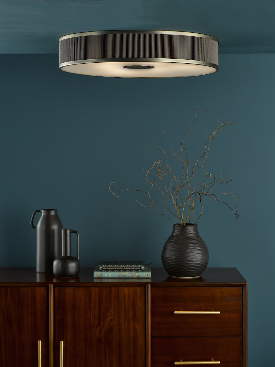 Looking for contemporary lighting that doesn't cramp your style (or your headroom)? Meet this flush ceiling light. This sleek, low-profile fixture is perfect for rooms with low ceilings, proving that you don't need to sacrifice style for practicality. The antique bronze finish and brown micropleat shade add a touch of sophistication, while the opal diffuser ensures a warm, welcoming glow. Don't be fooled by its compact size - this little beauty packs a punch, giving off plenty of light to brighten up your space. Part of this larger range, it's available in other colours to suit your decor. Who said lighting for low ceilings couldn't be chic?