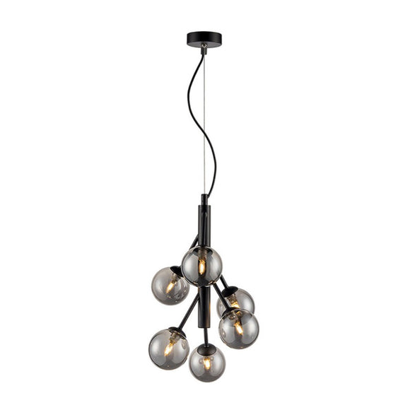 A 6-light long drop fitting, finished in matt black with smoke-coloured glass spheres. The cable length can be modified to fit a variety of ceiling heights.