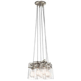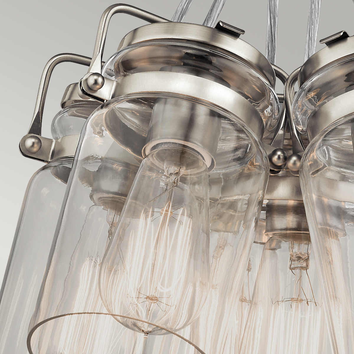 The vintage style of this collection gives a beautifully modern treatment to the familiarity and comfort of canning jars. This 6 light cluster pendant is finished in Brushed Nickel and has clear glass shades that can be cinched together if required.
