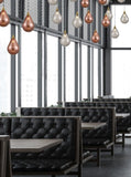 A 6-light circular spreader with aged brass metalwork and black cable suspensions. The cable lengths are adjustable on site prior to installation. It comes with a choice of copper, amber, smoked or clear glass.