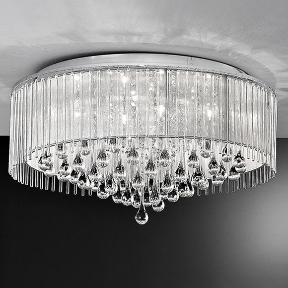 Chrome finish flush fitting with small crystal drops inside a lurex fabric shade with glass rod drops. Suitable for dimming if used with mains voltage halogen lamps. LED G9 lamps may be used but suitability for dimming will depend on the lamp and switch used.