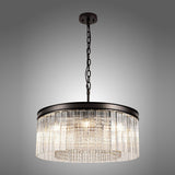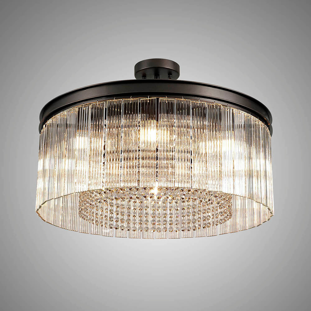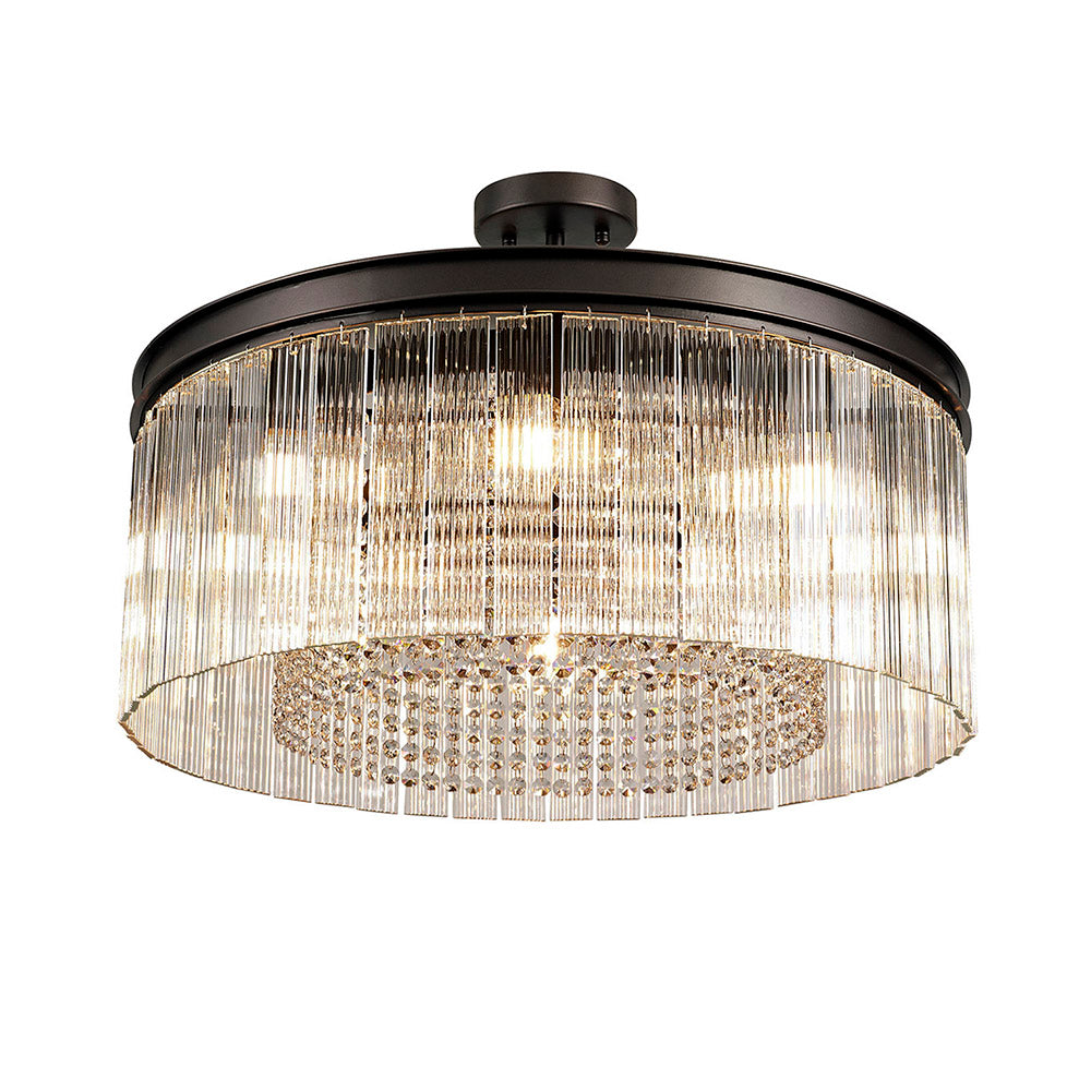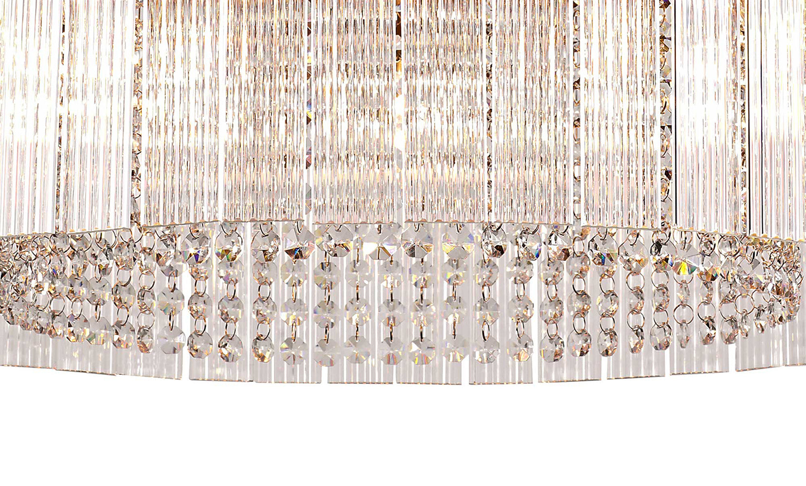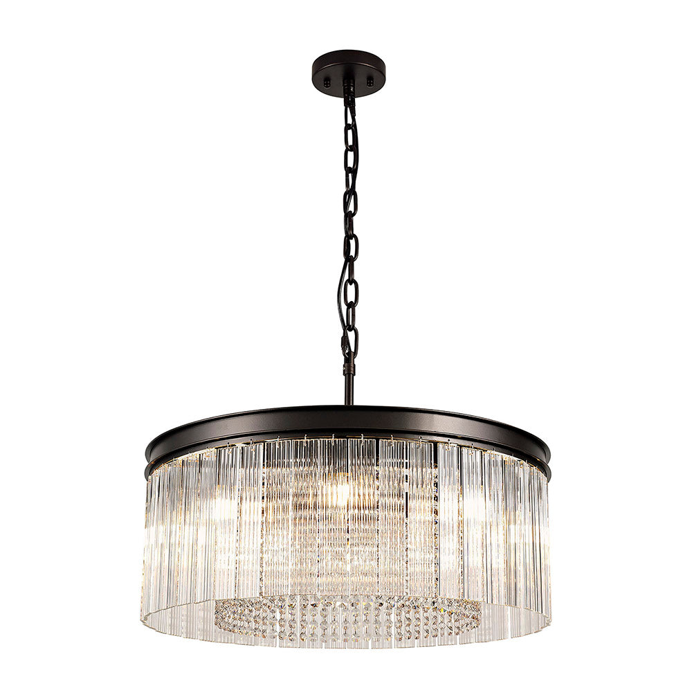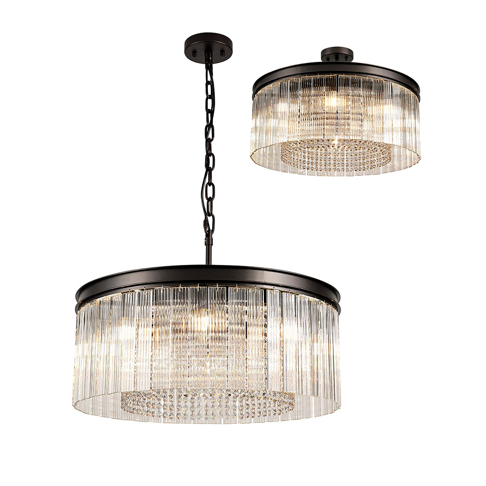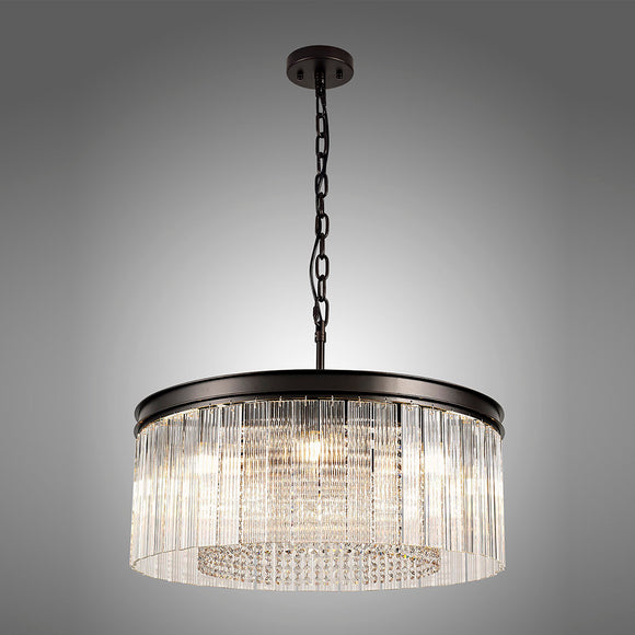 Traditional fittings form this comprehensive collection, the dark brown oxide colour finish of the framework is a more time-honoured tone for classic lighting styles. The solemn integrity of these models are maintained by the chosen crystal and glass pieces. A tier effect is created by alternating rings of long rectangular glass pieces with a ridged effect and strands of high quality, clear crystals buttons.