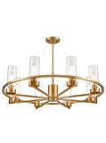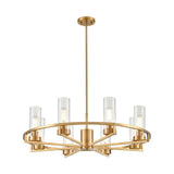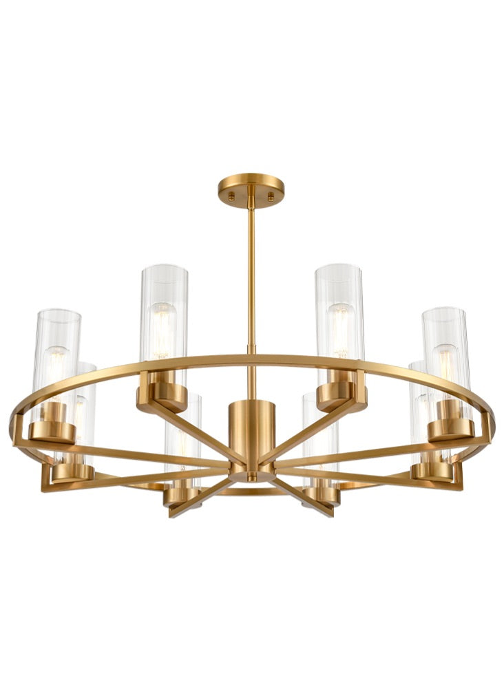 Aged brass finish wheel 8-light pendant with clear ribbed cylindrical glass shades. This pendant is supplied with three rods; 1x 155mm and 2x 305mm. Any combination of these rods can be used to vary the height of the fittings.