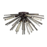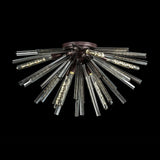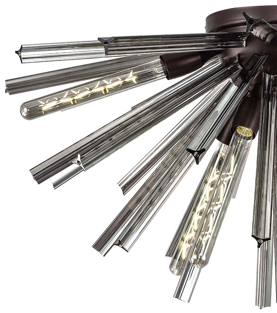 The collection presents an intriguing glass shape moulded into a three dimensional triquetra. The grooves along each sized glass create an appealing optical effect which is effortlessly enhanced with the use of tubular lamps. The wide variety of fixtures available in this range span from a 6 light semi flush to an impacting 32 light pendant. The complementing wall lamps available allow for further application built around the same lighting family. Each frame can be chosen with either a brown oxide, polished nickel or matt black frame with either clear, champagne gold or smoke glass.
