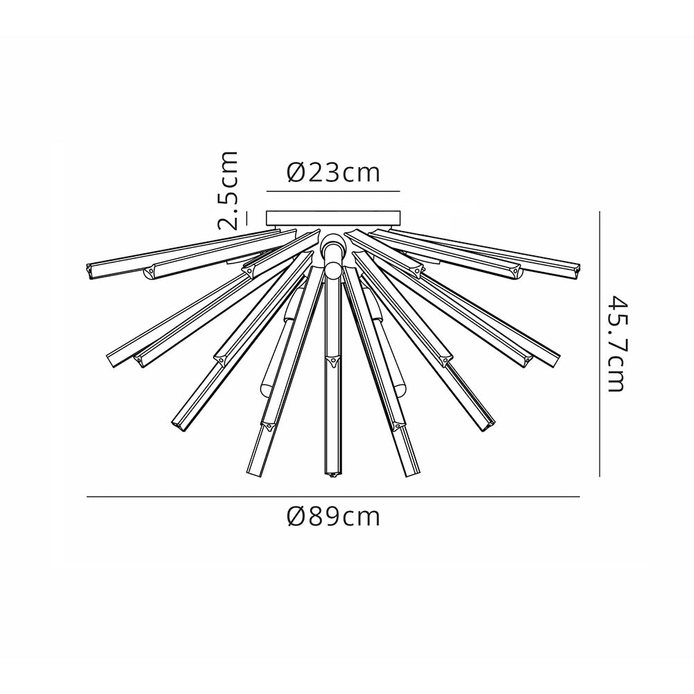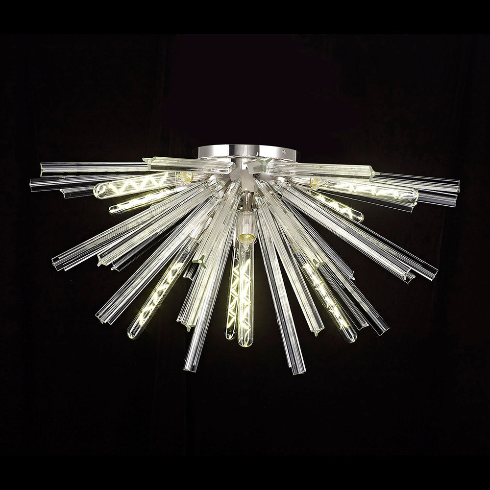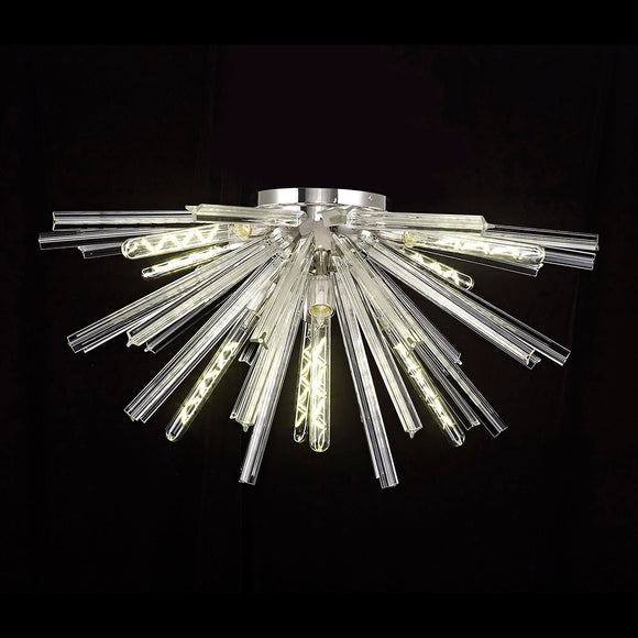 The collection presents an intriguing glass shape moulded into a three dimensional triquetra. The grooves along each sized glass create an appealing optical effect which is effortlessly enhanced with the use of tubular lamps. The wide variety of fixtures available in this range span from a 6 light semi flush to an impacting 32 light pendant. The complementing wall lamps available allow for further application built around the same lighting family. Each frame can be chosen with either a brown oxide, polished nickel or matt black frame with either clear, champagne gold or smoke glass.