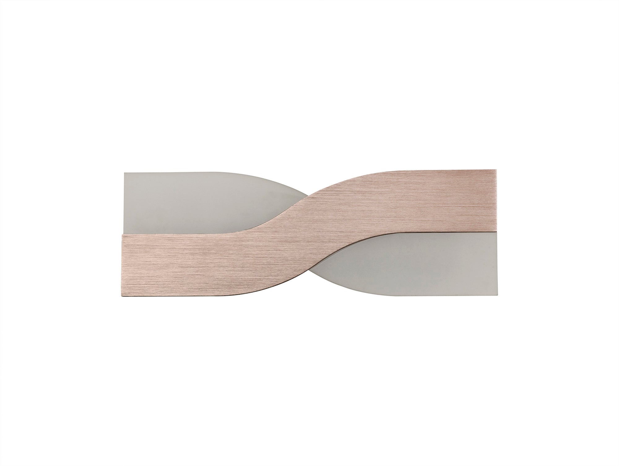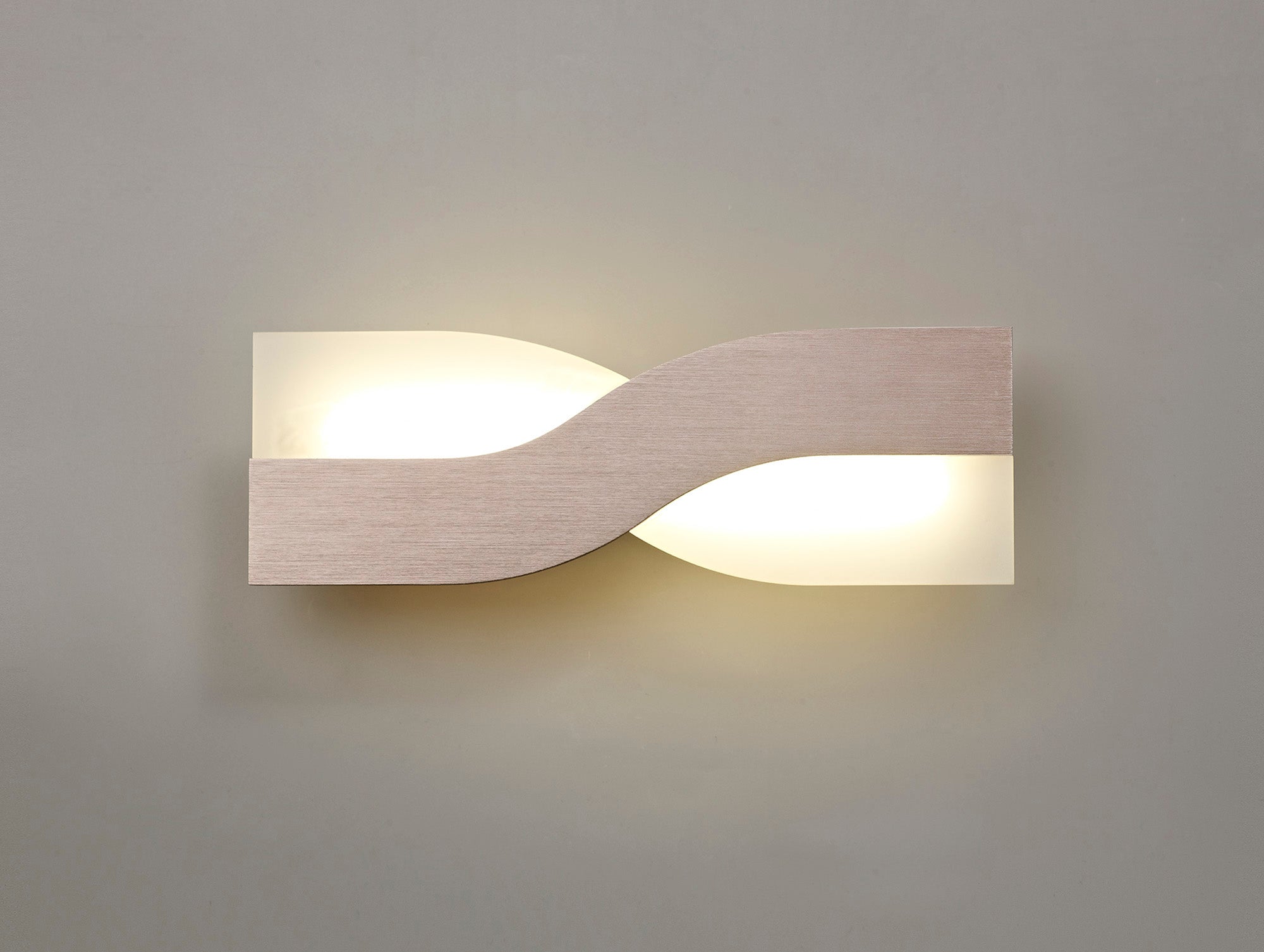 Wave wall lamps successfully use the metal framework and diffused integral LEDs to not merely provide a wall lamp but an artistic illuminated feature. The 3000K light is filtered through a waved acrylic piece which is setback behind the same form created from the metalwork. The metal component shape is reversed to overlap the diffuser making the entire wall lamp into a narrow 'x'. This composition in either Brushed brown or Brushed aluminium produces an intriguing light projection.
