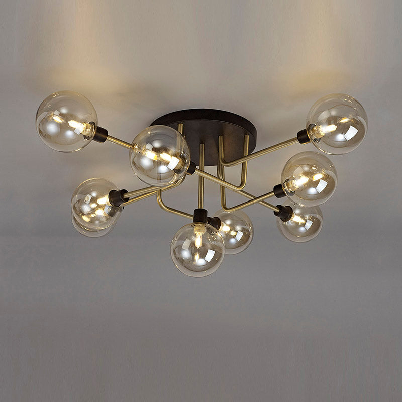 9 Light Flush Ceiling Fitting - Matt Black/Antique Brass/Cognac Glass (1230FAI28B)
