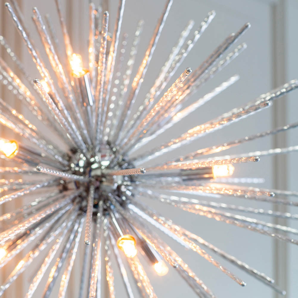 A modern version of a timeless classic from the past, finished in polished chrome featuring an 'explosion' of textured rods that create dramatic light patterns. Suspended from a height adjustable chain with clear flex, be brave and add this to modern or classic interiors to achieve that 'WOW' look...