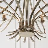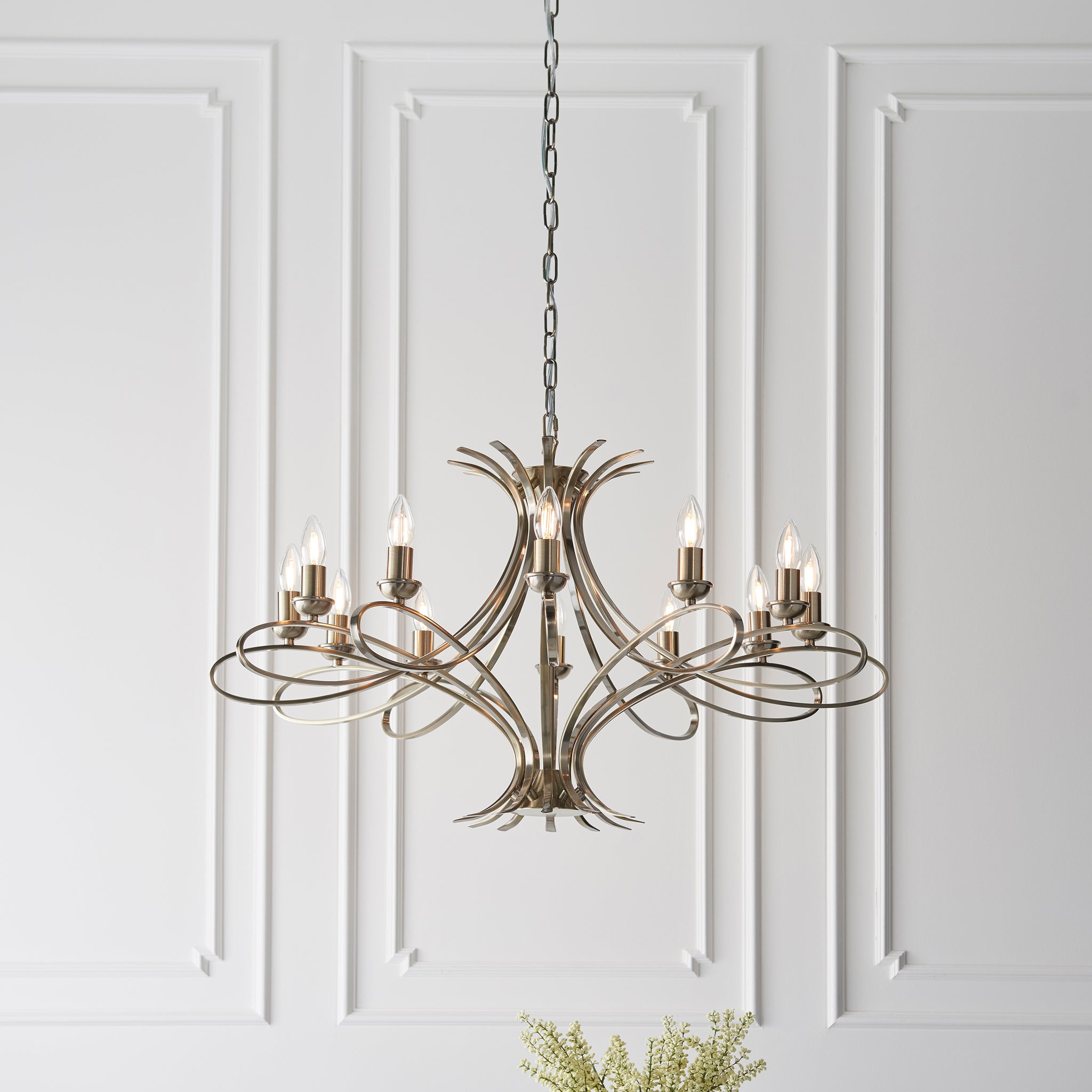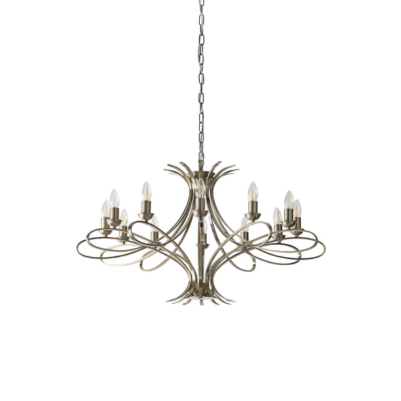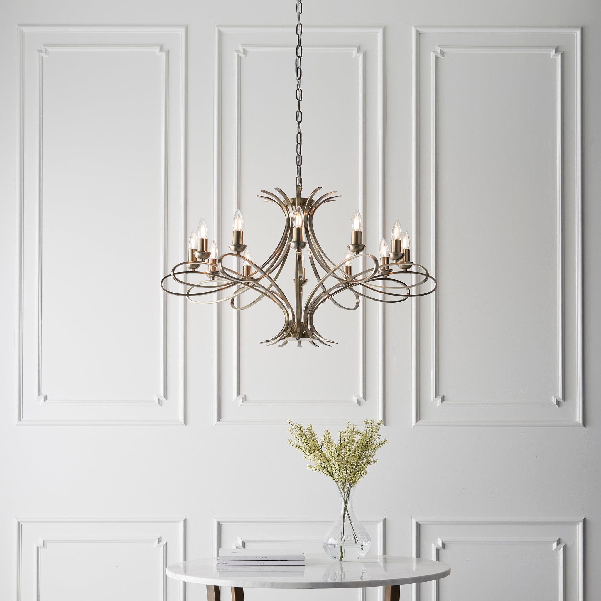 This is a decorative range featuring sweeping, curved arms. This 12 light pendant is finished in a brushed brass effect plate