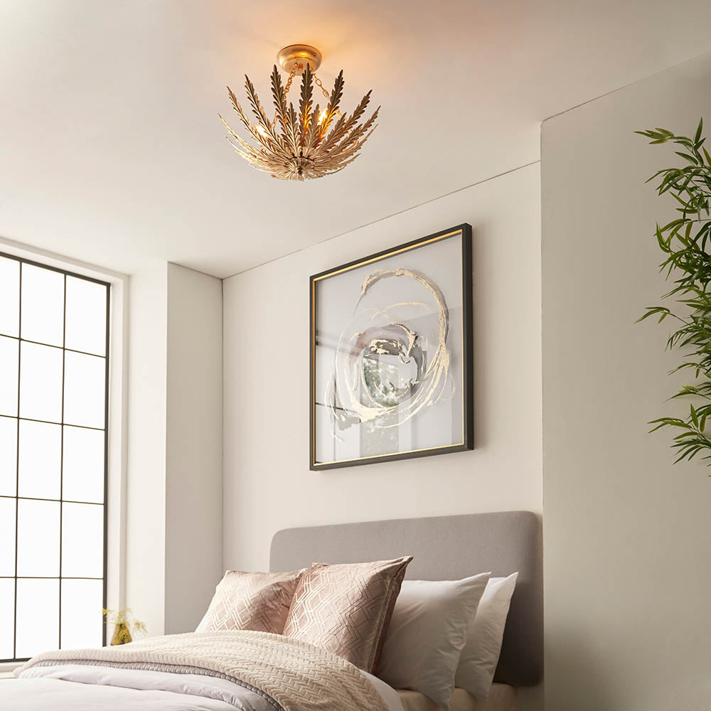 An opulent and ornate gold leaf finished floral semi flush light perfect for low ceilings. Decorative layered leaves create striking light patterns. This product is dimmable. Other family items available.