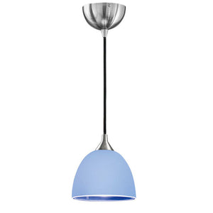 This pendant has a light blue glass on a satin nickel finish metalwork .