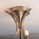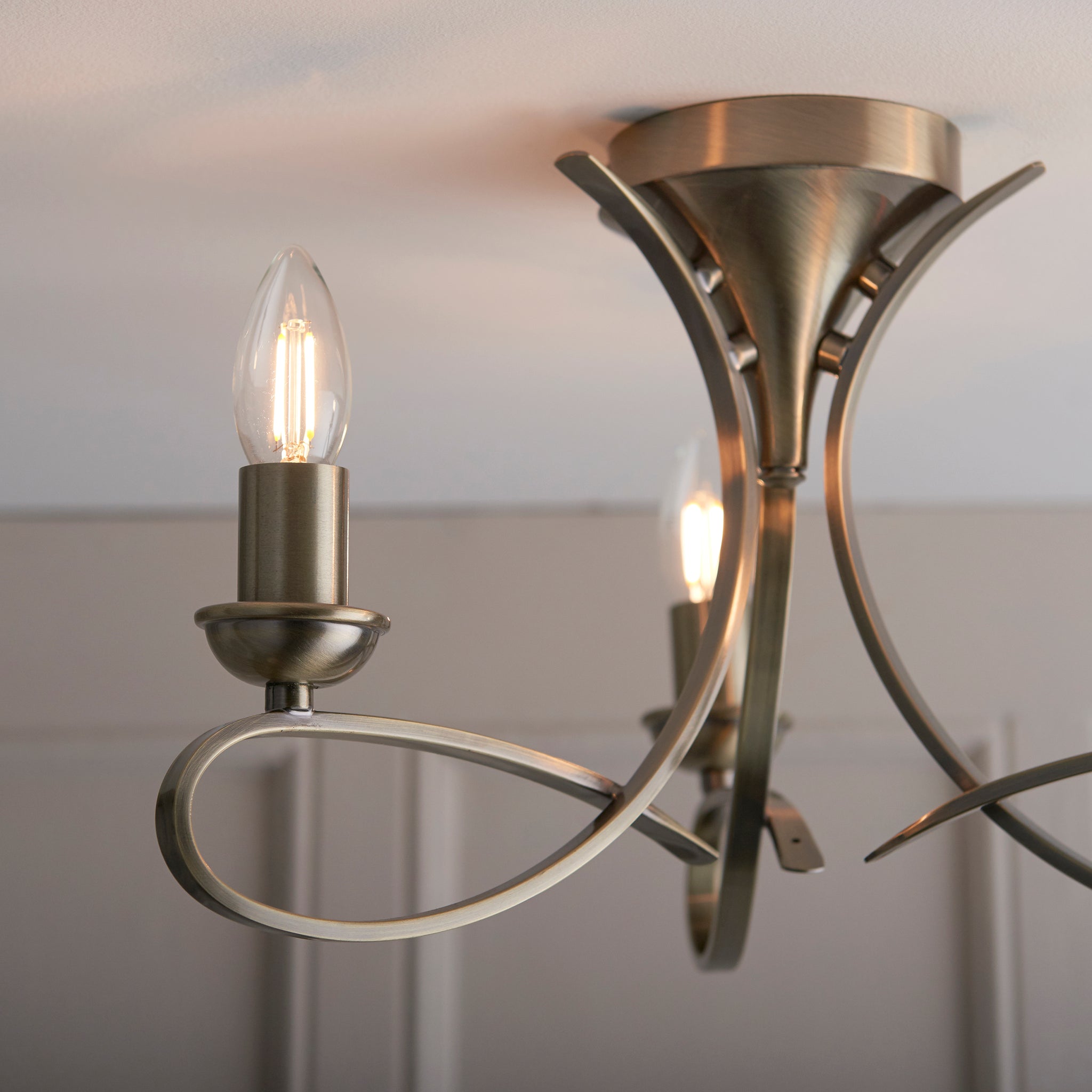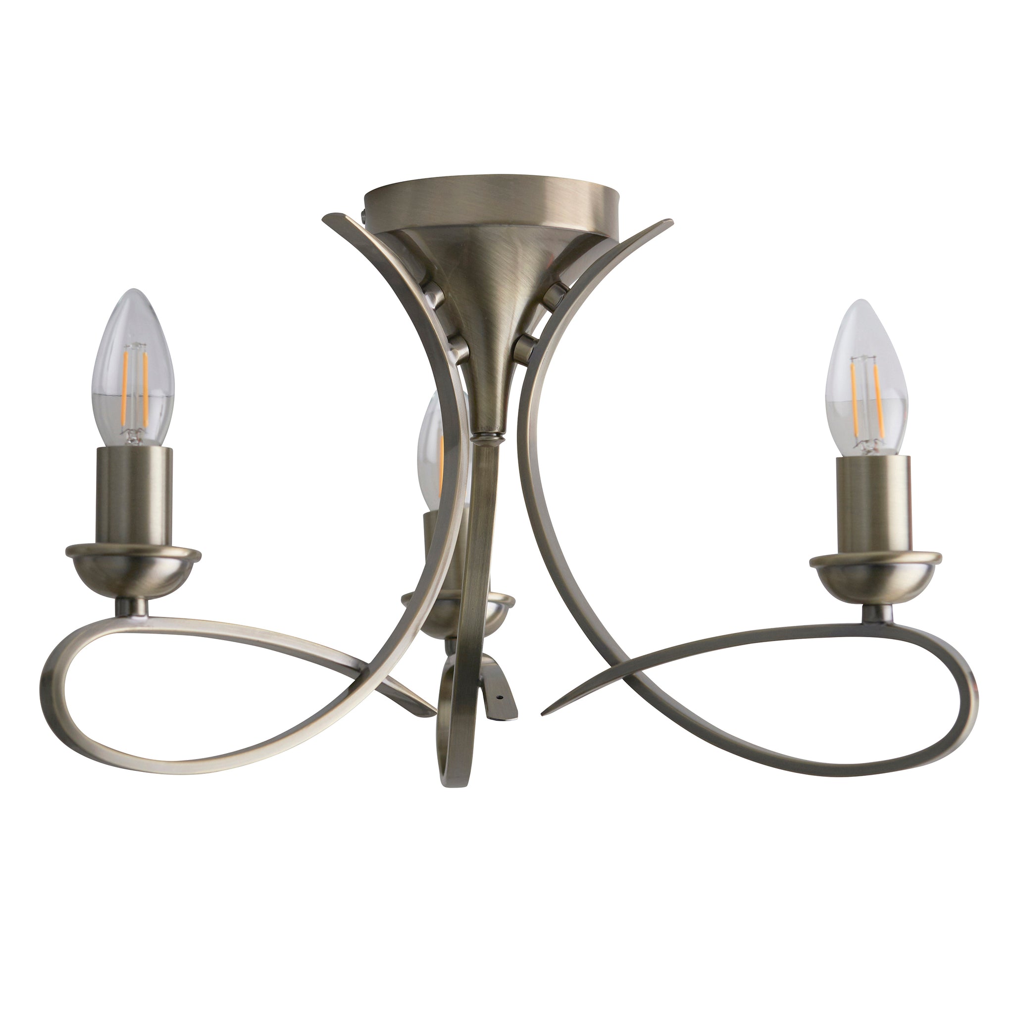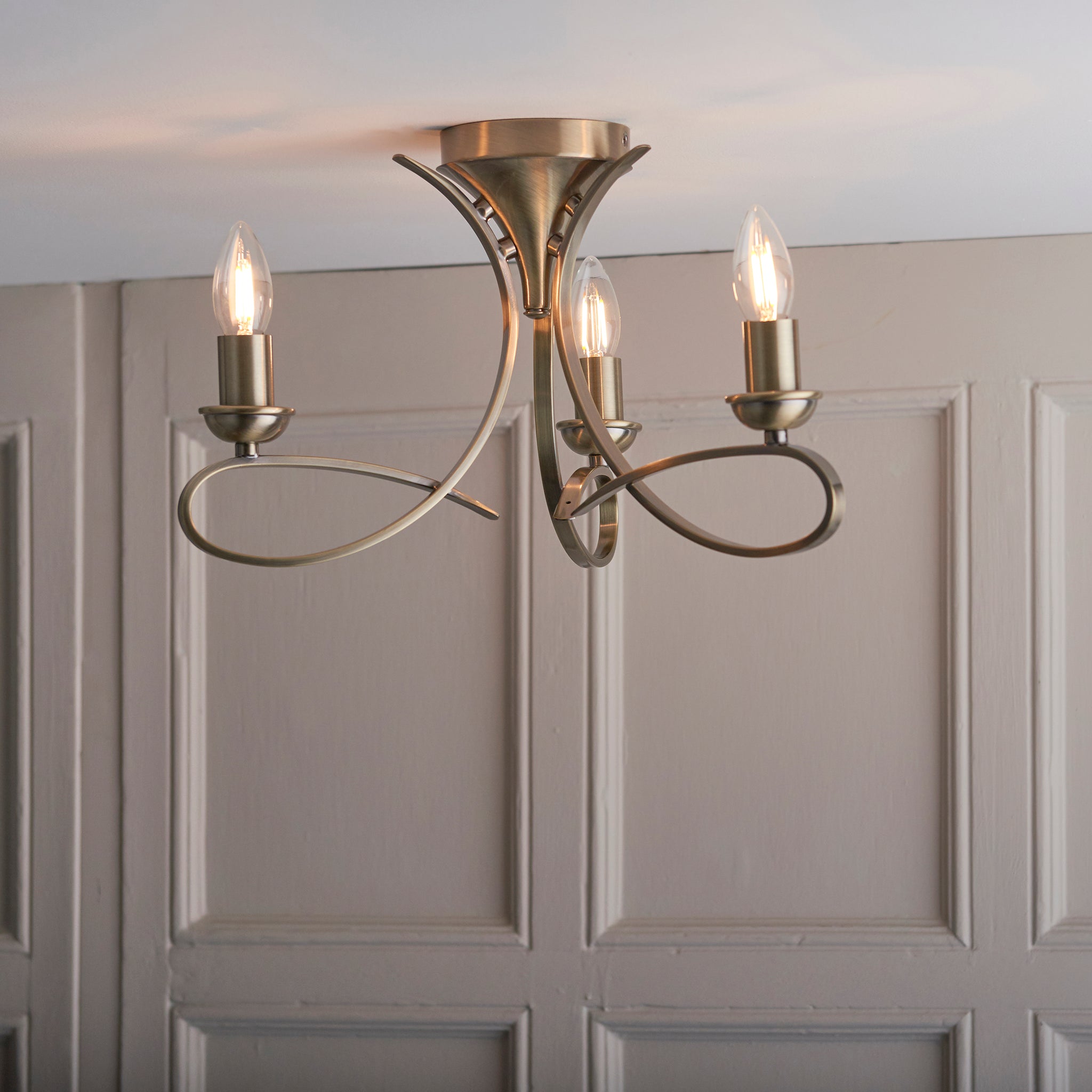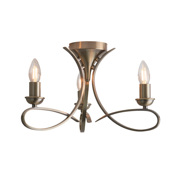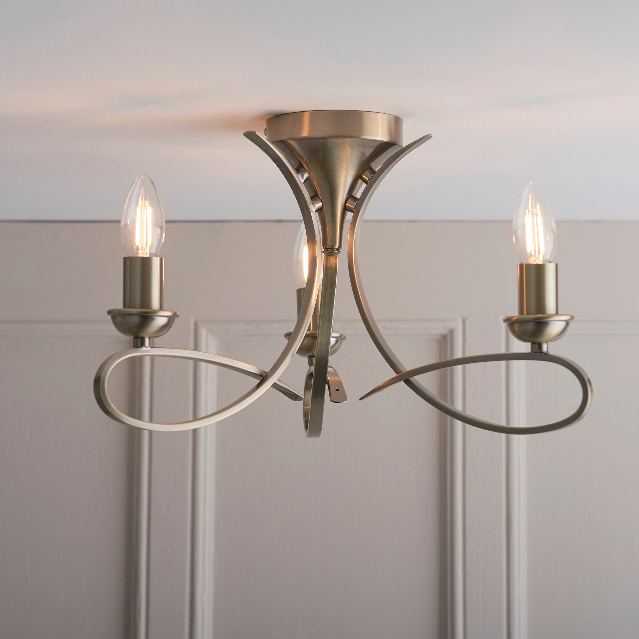 This is a decorative range featuring sweeping, curved arms. This 3 light semi-flush fitting is finished in a brushed brass effect plate