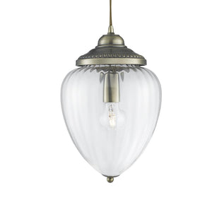 This antique brass pendant with clear ribbed optic glass lantern brings a traditional feel to any bedroom, living room, dining room or kitchen. The shapely ribbed glass shade features a classic nub on the bottom, as well as an ornate antique brass finish fitting at the top, leading up to a cable suspension. And the light ripples through the ribbed glass shade to beautiful effect.
