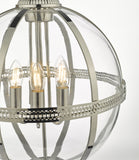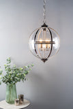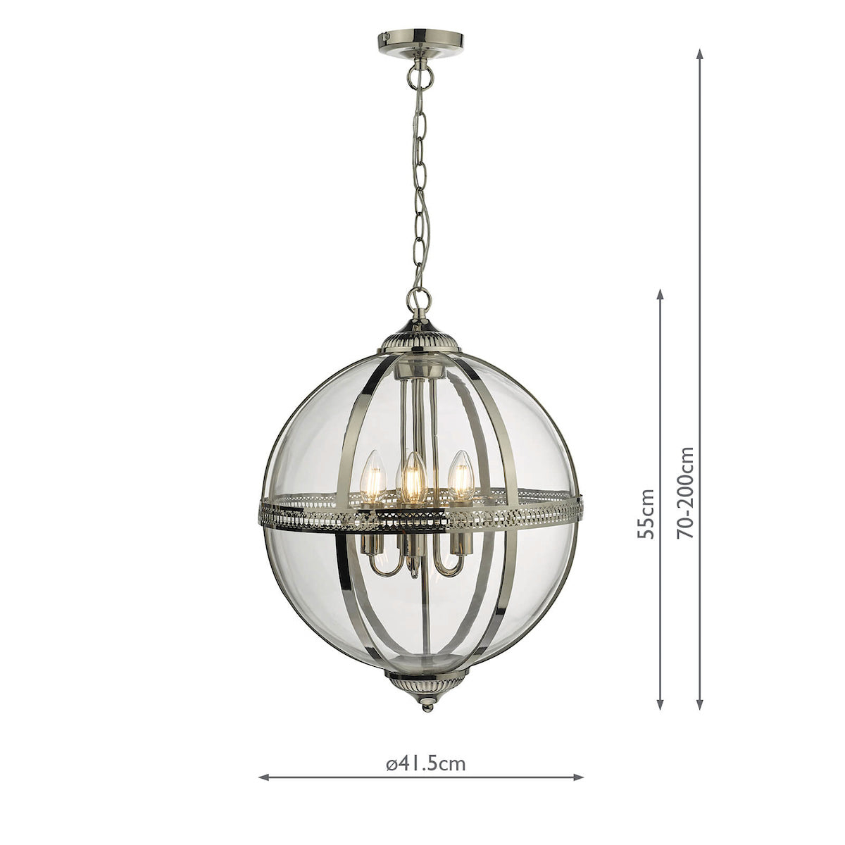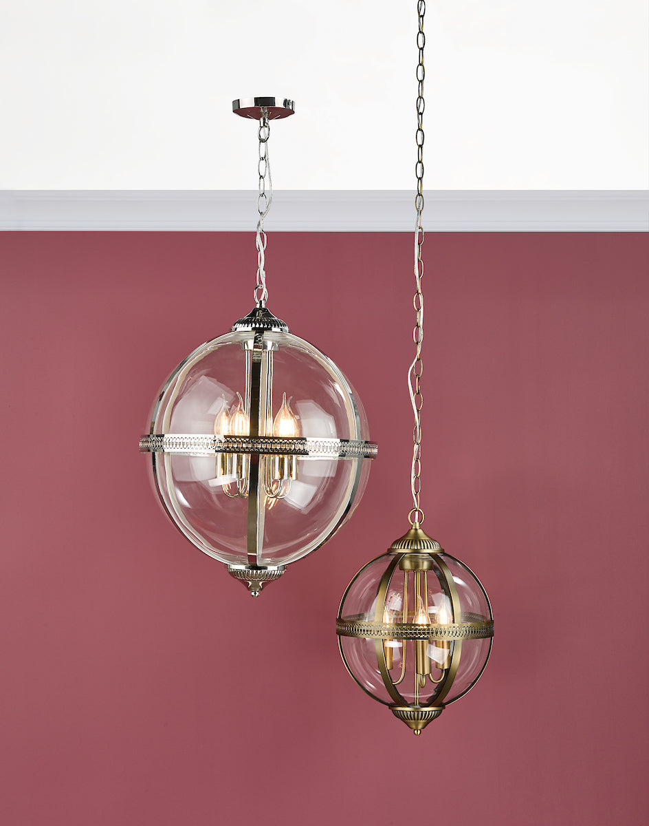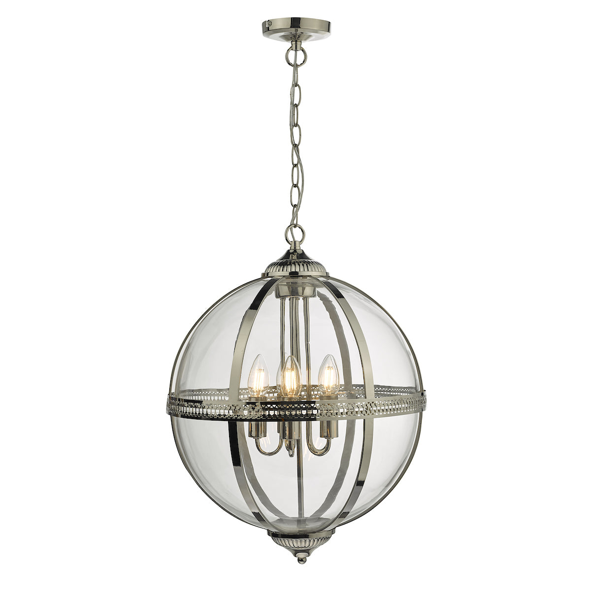 The 5 light Lantern in a polished nickel finish is decorative pendant featuring a spectacular orb glass shade with intricate metal detailing. This fitting is height adjustable. An eye-catching light fitting that would look fabulous in any living space.