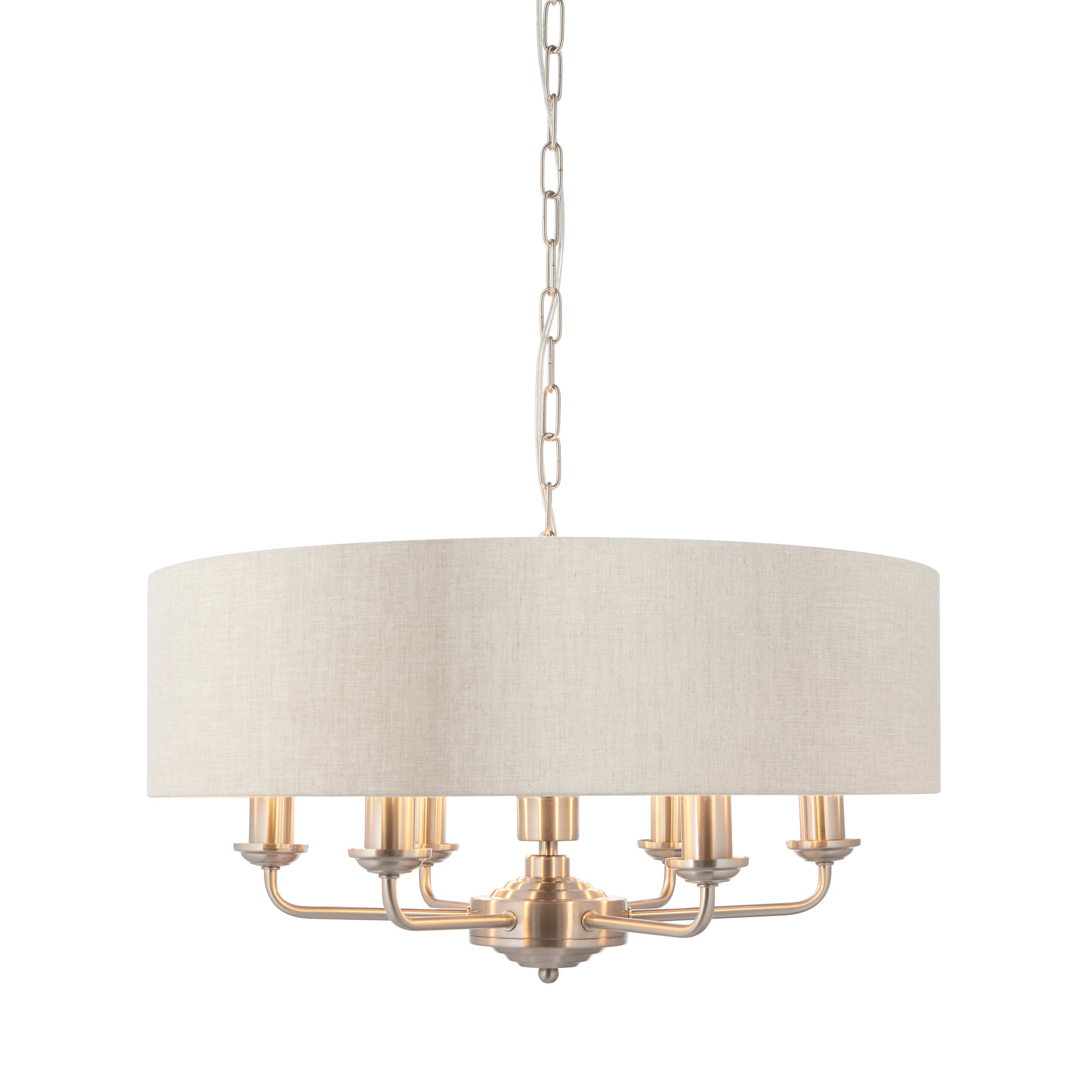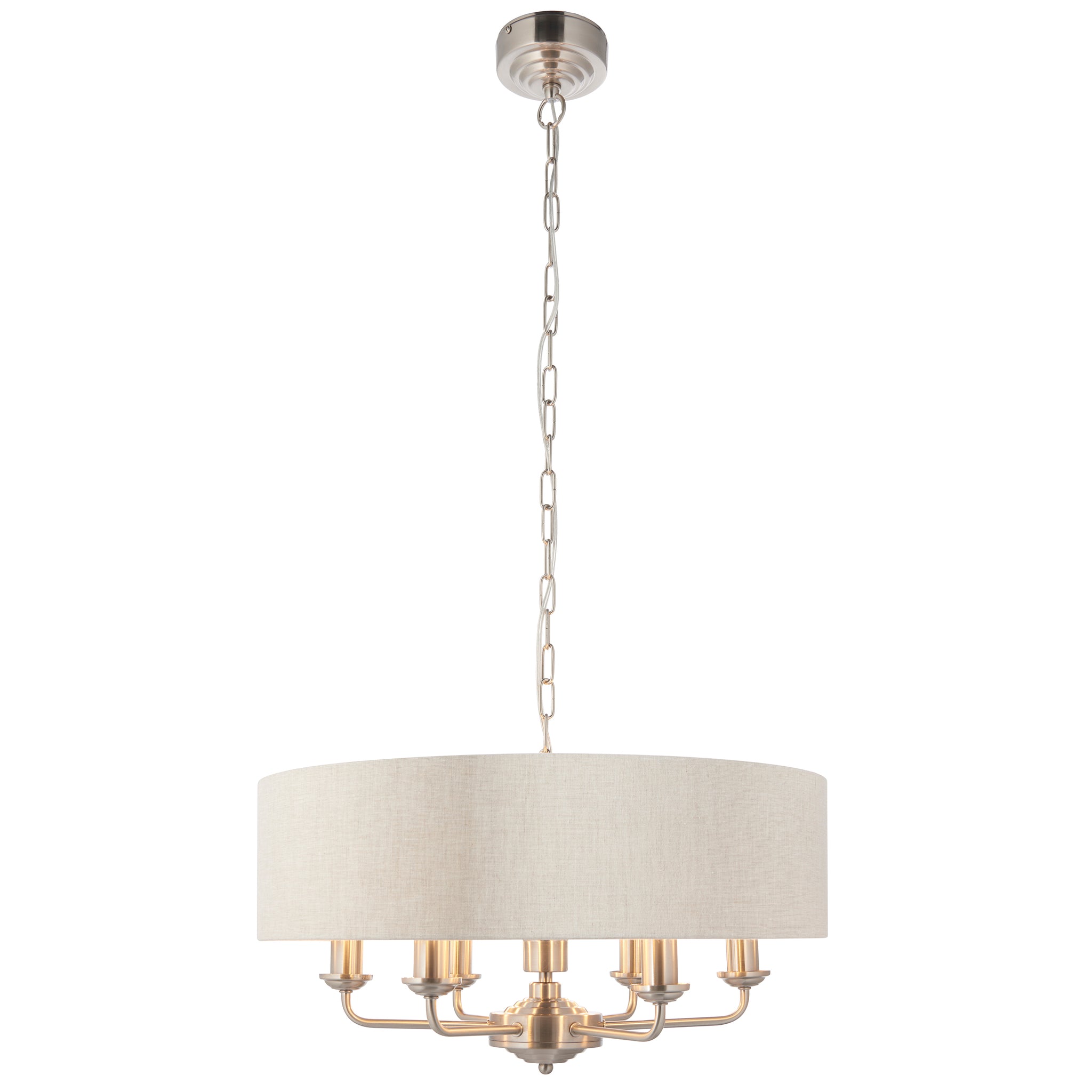 This pendant is a sophisticated mix of natural linen fabric with a reflective brushed metallic inner and brushed chrome metalwork. This beautiful pendant is the perfect timeless addition to modern and classic homes of today.