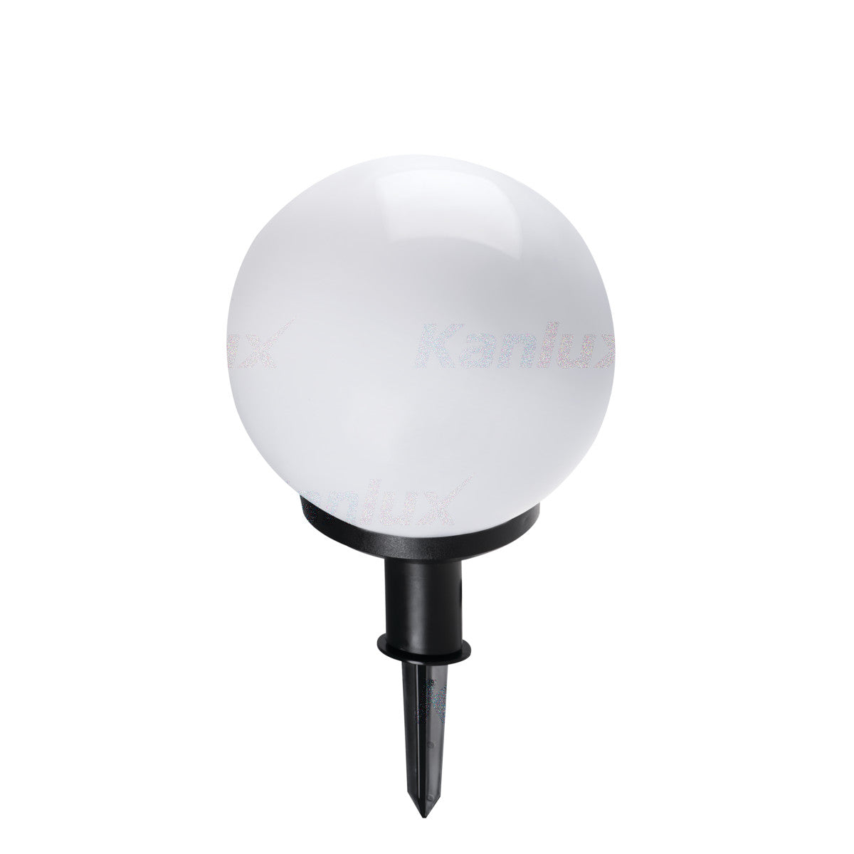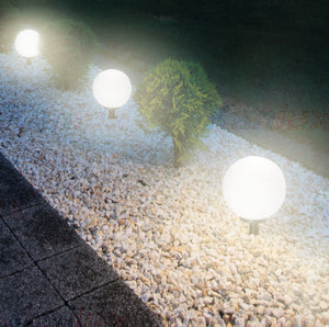 It is made of strong white polycarbonate and is IP44 rated. It takes a E27 bulb. We experimented in our showrooms, and it looks equality great with white bulbs or colourful bulbs. It comes complete with a 3 meter power cord with plug and detachable ground pins to fix in the lawn.