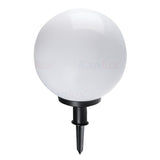 It is made of strong white polycarbonate and is IP44 rated. It takes a E27 bulb. We experimented in our showrooms, and it looks equality great with white bulbs or colourful bulbs. It comes complete with a 3 meter power cord with plug and detachable ground pins to fix in the lawn.